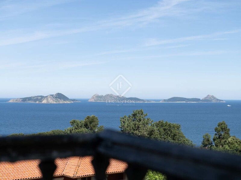 This magnificent multi-level residence is located in "Los Abetos", one of the most sought after neighbourhoods in Nigrán. It offers stunning views of the towns of Baiona and Nigrán, as well as the estuary and the Cíes Islands. The residence is thoughtfully distributed over three levels and boasts a generous garage and versatile multipurpose space. The main distribution hall can be accessed from the garage in the basement or the main entrance. From the hall to the left we find the day area, with an open-plan kitchen connected to a spacious living and dining area. A corridor leads us to the sleeping quarters where we find five spacious bedrooms, one of them en-suite, and a complete bathroom. We then ascend to the attic to find the luxurious main suite, complete with a private terrace and a dedicated office space. The views from this level are simply breathtaking, with panoramic vistas of the Baiona estuary, Nigrán, and especially, the Cíes Islands. The beautifully landscaped grounds include a swimming pool and a dedicated barbecue area, perfect for entertaining. A section of the plot is planted with varied fruits trees. A long, outside porch area adds to the charm and functionality of the house. This home seamlessly combines elegance and functionality, it is ideal for families seeking to live in a tranquil and exclusive setting, but within a short distance to all basic services, including international schools in the region. Do not miss the opportunity to own this exceptional property in one of Nigrán's most exclusive neighbourhoods. Contact Lucas Fox today for more information or to schedule a viewing.