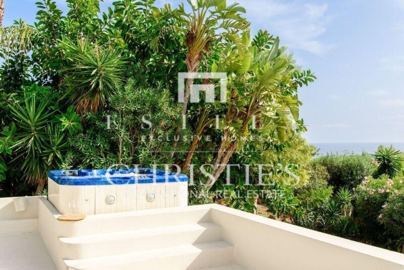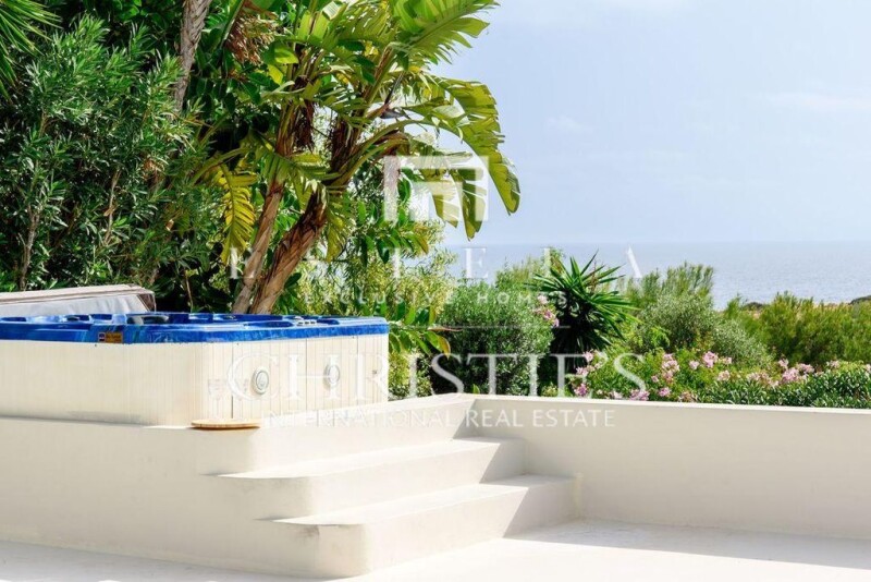 Estela Exclusive Homes is proud to present you this unique and exclusive mansion, located on the best location of Cap Martinet, which is by far the most high-end areas of the island. This luxury residential sits on a front-line 3.693m2 plot and enjoys unobstructed sea views over the Mediterranean Sea and Formentera. This magnificent property offers unlimited possibilities for entertainment, especially for large groups, which makes it ideal for big families, hosting retreats or simply enjoy the number of possibilities and comfort you could wish for. Counting a total of 15 en-suite bedrooms, of which 5 bedrooms are located the main house and the multiple guestrooms divided around the property. This luxury residential adopts a contemporary Ibiza stye with open and spacious areas, that gives you the feeling like you are in a mini resort. Surrounded by nature, large tropical garden with palm trees, 8x5m2 infinity pool with waterfall, a private nightclub Unique opportunity in Ibiza. SPECS: Bedrooms 15 Bathrooms 13 Specifications 3.693 m² land – 714 m² built 15 rooms up to 30 guests with private bathrooms and climate-control 10 rooms with 2 single beds 5 rooms with double beds, 13 bathrooms. LOCATION: Located in a triple A location, the best location on the island in a very quite and isolated area of Cap Martinet, on the south-east of this island. The property sits on a 3.000m2 plot, front-line with breathtaking sea views from the garden and pool side, all the way to the famous island of Formentera. South orientated, sun all day long. Surrounded by nature, stone cliffs with a nearby hiking path and 2 semi-private bays on walking distance from the house. Nearby areas such as Talamanca beach on a walking distance, as well as the village of Jesus with supermarkets, very good restaurants, 5min away from Ibiza town, Marina Botafoch, HOUSE: Entering the house you see the large living room with fire place and have direct views to the pool and over sea. Amazing Ibiza style kitchen with professional equipment, including a teppanyaki plate, perfect to cater big groups. The spacious and stylish interior are combined with beautiful materials and natural stones for a real Ibiza feeling. The house counts a total of 15 bedrooms with en-suite bathrooms ,of which 5 are connected in the main house, including a 41m2 master bedroom on the first floor with the best sea views and another suite on the first floor of 26m2. Outside you find the large pool of 8 by 5-meter with waterfall feature, outdoor bar, jacuzzi and sauna. Under the pool there is a underground nightclub that fits up to 70 people, including DJ-booth and bar. GARDEN AREA: Amazing full grown exotic garden with large palm trees, a lot of greenery, stunning sea views and many cozy lounge areas and cabanas. Including a 11 by 7 meters yoga platform, complete outdoor kitchen with BBQ area and large table that fit 30 people. SPECS: - Jacuzzi - Sauna - pool with jet-stream - waterfall - pool-bar - cabañas - outdoor kitchen - Meditation / yoga area - outdoor gym - barbecue area - lounge areas throughout the garden - all rooms air conditioned - music system - security office - 2 private parkings - fireplace.