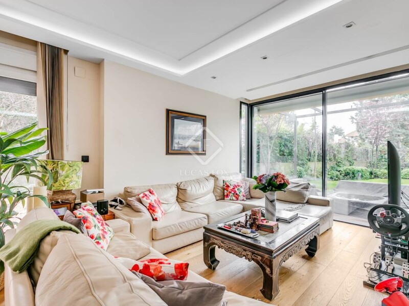 Lucas Fox presents this spectacular detached four-bedroom villa with a garden and pool, located in one of the most prestigious areas of Soto de la Moraleja. Located within an exclusive development with very few neighbors, this property stands out for its elegance, privacy, and the perfect combination of luxury and comfort. With a constructed area of approximately 261 m² and a 350 m² plot , the house features a charming garden and a private pool that provide the ideal space to enjoy comfort in an exclusive setting. Layout: Upon entering, a spacious and inviting living-dining room welcomes you with large windows, offering a bright and open atmosphere that connects to a stunning designer kitchen. This kitchen features a large centre island and a sliding door that allows the kitchen to be integrated into the social area. This floor also includes an study area and a guest toilet. From the living room and main bedroom, there is direct access to a pleasant covered porch of approximately 40 m², which leads to the garden and private pool. On the first floor, a entrance hall leads to two bedrooms, each with an en suite bathroom . Finally, the master suite features a large dressing room, a spacious en suite bathroom , and a pleasant terrace with garden views. The basement of the property houses a bedroom with an en-suite bathroom , a machine room, an additional space that can be used as a wine cellar or study, and direct access to the large garage, which includes a storage room and two outdoor parking spaces. Additional qualities and features: This property stands out for its top-quality finishes, with top-quality materials and an A energy rating. It features a geothermal system for underfloor heating heating and air conditioning, as well as security windows that guarantee comfort and protection.