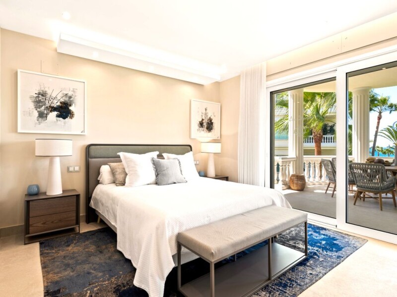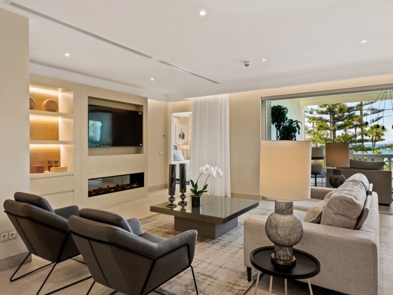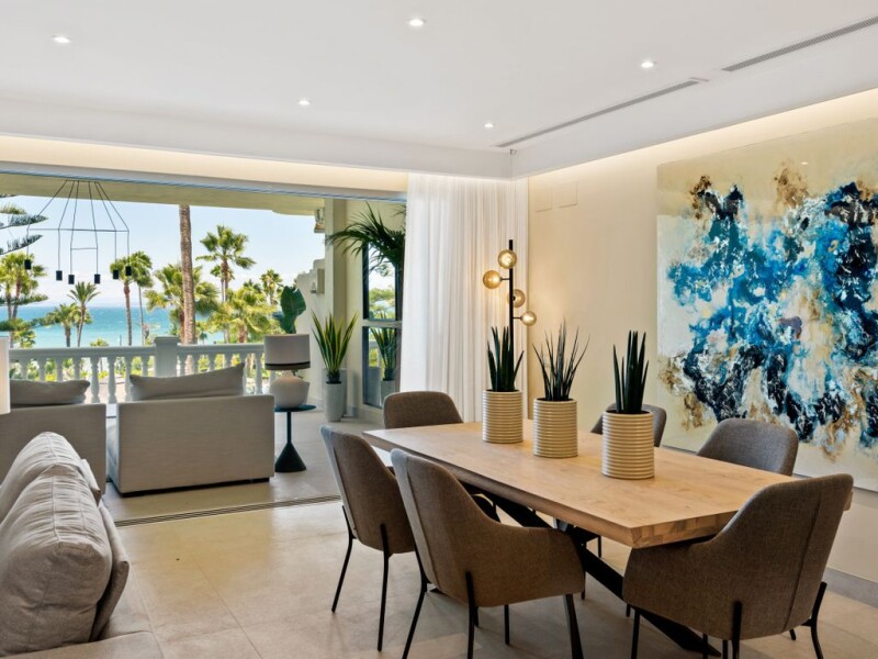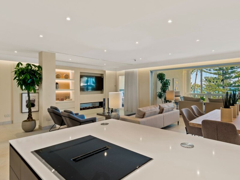 Front line beach with open sea views: fully renovated to the highest standards, 3-bedroom apartment located in a 5* complex on the New Golden Mile. South facing with direct access to the beach and walking distance to several beach restaurants and bars. Paseo ready towards Estepona town center and port. Entrance hallway, living-dining area with open plan fully fitted kitchen. Master bedroom en suite and two guest bedrooms en suite. Direct access to the covered terrace. Lush gardens and community pool. A unique quality property, the very best of luxury Mediterranean beach living!.
