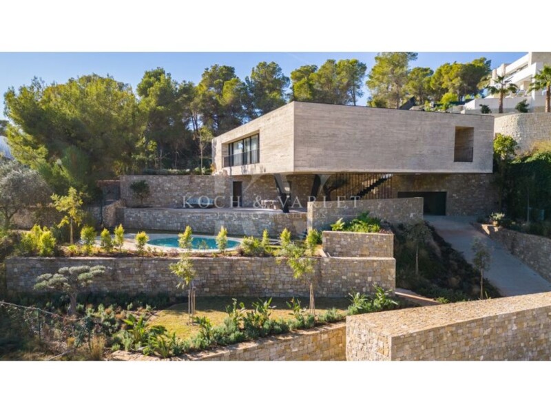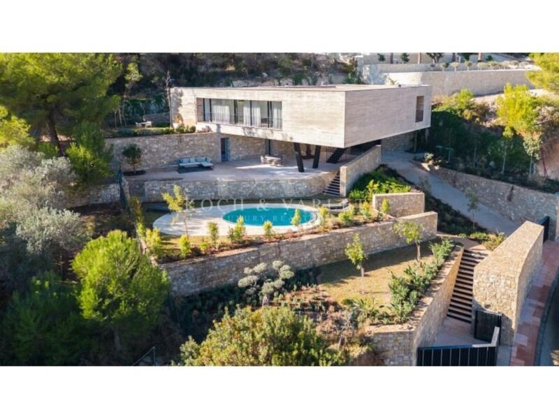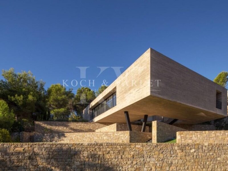 When architecture, design and quality are combined in perfect harmony with nature and the surrounding environment. For sale, this one of a kind concrete property is perfectly integrated into its environment, floating in the air, it is located on a fascinating plot in Benissa on the Costa Blanca, the house is surrounded by nature and inspires tranquility and calm. Unique design with the best qualities can be found in this just completed new villa. The exterior facade in visible concrete is spectacular. It imitates an elegant wood look and makes this unique villa a real work of art The villa is distributed on one level and offer stunning views of the Mediterranean landscape, the blue of the sea and the beauty of its landscaped garden. We access the property by a private gate, arriving on a carport with front accesses to a private garage for two cars. Going up metal stairs with the most innovative design, we arrive in an entrance hall which opens onto the living room. This one level house boasts a fully equipped kitchen with high-end appliances, a living-dining room bathed in natural light thanks to large bay windows opening onto the surrounding nature, 3 bedrooms and 3 bathrooms, all ensuite, each of them with an access to the outside. The house has also a private apartment, which has a fourth bedroom with private bathroom. The exterior consists of landscaped gardens, covered and sunny terraces, surrounding a swimming pool of turquoise waters. You will appreciate every detail, the subtlety of each window, bringing natural light at every moment. The use of materials such as natural stones, wood effect stamped concrete and travertine marble. Latest technologies, underfloor heating, air conditioning, smart home system, security system A unique architectural design that overwhelmingly enhances and exhibits the aesthetic beauty of materials, exploits textures, and harmonizes volumes. The house is a haven from which to contemplate nature in a landscape that has the Mediterranean Sea as a backdrop. A unique property presented by KOCH & VARLET LUXURY REALTORS S.L., your expert real estate agency in luxury properties on the Costa Blanca in Spain, Denia Javea Moraira Benissa Altea.