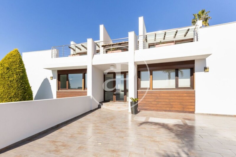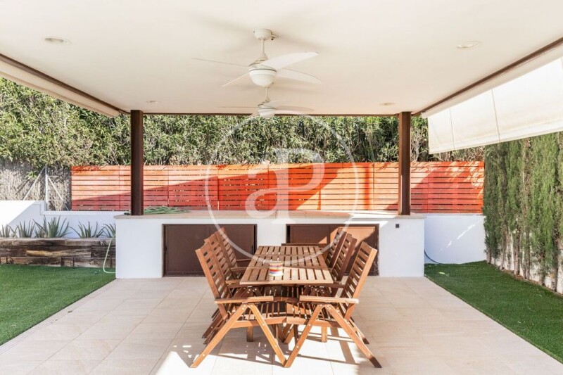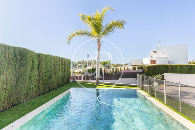 For a long STAY, we find this magnificent bioclimatic house of 260 m2 of modern style and great qualities located in the Bosque de Chiva urbanization (València). The El Bosque urbanization has private security with access control, a concierge service, a tennis and golf club. 10 km from the airport and 20 km from the city of Valencia. The property consists of two floors. On the ground floor we find its hall, a spacious living room, a designer kitchen with top brand appliances, a service bathroom and two bedrooms. The master bedroom with bathroom en suite has a hydromassage bath and shower with sauna. We access the first floor, through its wooden staircase with open steps and in it we find two spacious bedrooms with access to a spectacular 65 m2 terrace overlooking the golf course, study area with glass floor on supported hall with stainless steel beams and a complete bathroom. All rooms have fitted wardrobes and the carpentry is all made of wood. In the basement we find a garage with capacity for two vehicles and a closet of 11 linear meters with shelves, coat racks and drawers. On this same floor we find a service room and a toilet. The house has an excellent south orientation that offers sunlight all day on the main facade. The house consists of 260 m2 on a 1000 m2 plot with natural vegetation and high-quality artificial grass. In the exterior area we find a porch with wooden beams and a cellular polycarbonate ceiling attached to the house on the east facade, its pool with stone-type porcelain cladding and an exterior 35m2 iron structure pergola that includes lighting, fans and awnings. On the north facade it has a built-in barbecue, with a work bench and a sink. The house is bioclimatic, which allows very important energy savings and compensation with the outside temperature that offers high comfort. It is heated by radiator heating and Acs with gas boiler. The exterior carpentry of wood on the south facade with shutters (automatic on the ground floor) and the rest of the house in brown aluminum. This property is completely independent but it also has access to an interior urbanization of a group of houses that has a community pool and paddle tennis court. The El Bosque urbanization is perhaps the safest urbanization in Valencia. There is no doubt that its 18-hole golf course with its clubhouse, sports and leisure areas, first-line restaurants, swimming pools and all kinds of services such as school transport, make this an extremely high-level development. It is worth noting the good communications and access, very close to the airport and the exits to all parts of the city. Unbeatable environment for a quiet, safe and high quality of life. Call us to see it, we will be happy to assist you.