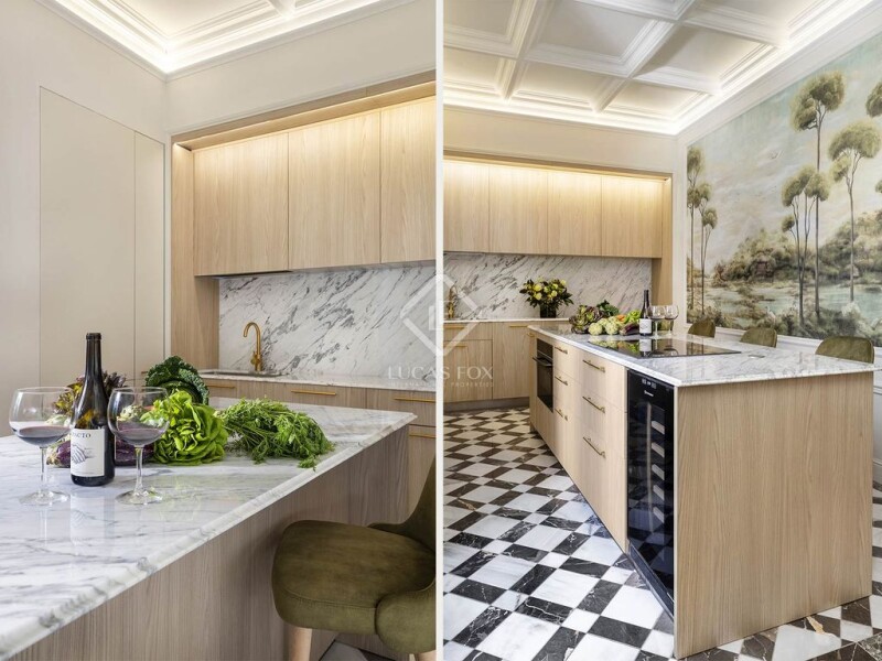 This exclusive property is situated on the top floor of a classic corner building in the prestigious Right Eixample, just a few metres from Passeig de Gracia and only two blocks from Plaça Catalunya. The property occupies the entire fifth floor of a 1900s building, which is equipped with a modern lift. Residents also have access to a communal terrace with spectacular panoramic views. Spanning 161 square metres, this bright property offers a well-designed layout featuring three suite bedrooms and an additional room that functions as a walk-in wardrobe. It boasts seven French balconies with beautiful street views, along with a private 10-square-metre green terrace, making it truly unique. Each of the three suite bedrooms is completely separate from the others, ensuring privacy for the future owners. One of the suites is currently organised as a home office but can easily be converted into a double-bedroom suite. The fully equipped, semi-open kitchen has access to a private terrace and a laundry room. The kitchen features Italian custom-made cabinets, Siemens appliances, and a wine cellar. This stunning apartment has been meticulously designed and is ready for immediate move-in. All furniture, appliances, and decorations are included in the price. The property is the result of an exceptional collaboration between architects, designers, and highly skilled craftsmen, combining sophisticated modern chic with the charm of classical elements. High-quality materials such as natural wooden floors, marble, and custom-made mirrors were used in the refurbishment. The carpentry is entirely new and bespoke, offering superior thermal and acoustic insulation. The ceilings, which range from 3.60 to 3.70 metres in height, create a sense of spaciousness and grandeur, with indirect lighting accentuating the intricate handcrafted plaster ceilings and mouldings. The brand-new furniture was designed and custom-made in Europe, and some pieces have been restored from antiques. Each bedroom features built-in closets with interior lighting and ample storage space. The apartment also offers an integrated sound system, underfloor heating in the kitchen and bathrooms, dual-zone air conditioning, radiator heating, a home cinema, a jacuzzi in one of the master suites, and a bioethanol fireplace. Rare and luxurious natural marbles further elevate the residence's exceptional design. The interior design and execution of this magnificent property were carried out by a prestigious design studio, making this a unique opportunity to acquire an exceptional home in one of the most desirable locations in Barcelona. Please contact us for further information.