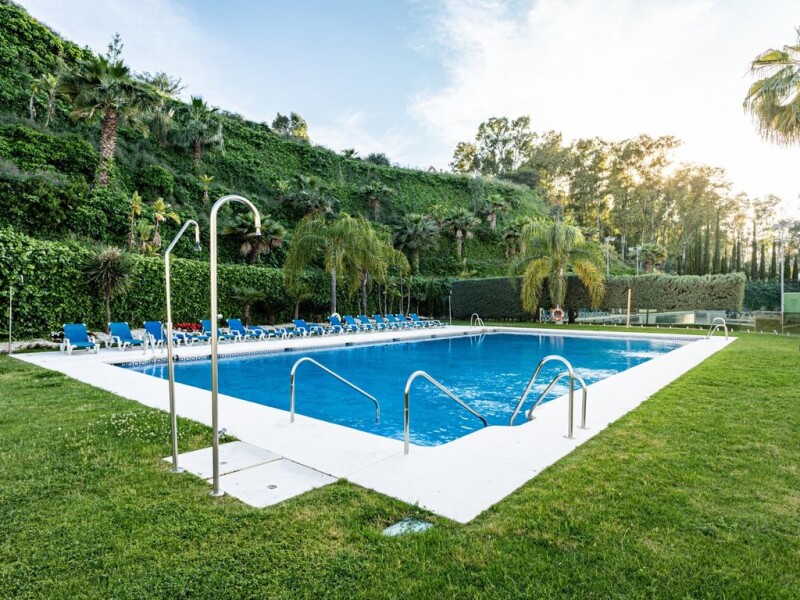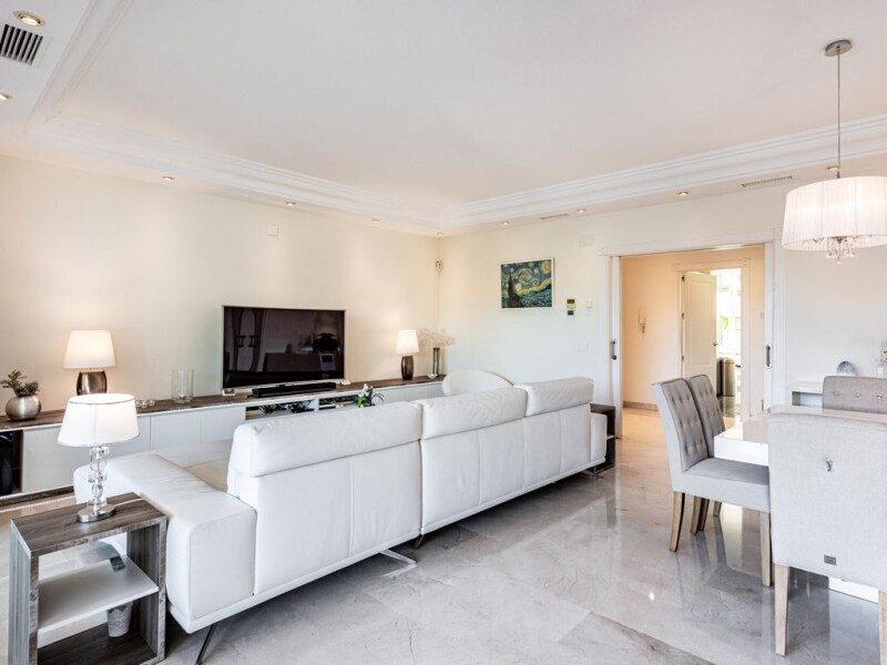 Recently renovated modern apartment in Nueva Andalucia. Due to its location, in the heart of the golf valley, it is ideal for golf lovers with close proximity to some of the best golf courses on Costa del sol. The apartment is located on an elevated ground floor and comes partly furnished. It offers 3 bedrooms and 3,5 bathrooms with a fully fitted kitchen with a separate laundry room. The spacious 160 square meter terrace includes an outdoor kitchen and a Jacuzzi and it is possible to completely close it off, with sliding glass windows. It has underfloor heating, an individual air conditioning system throughout the whole apartment, and comes with two parking spaces as well as a big storage room. The community offers 24 hours gated security, a padel court and swimming pools (including one heated).