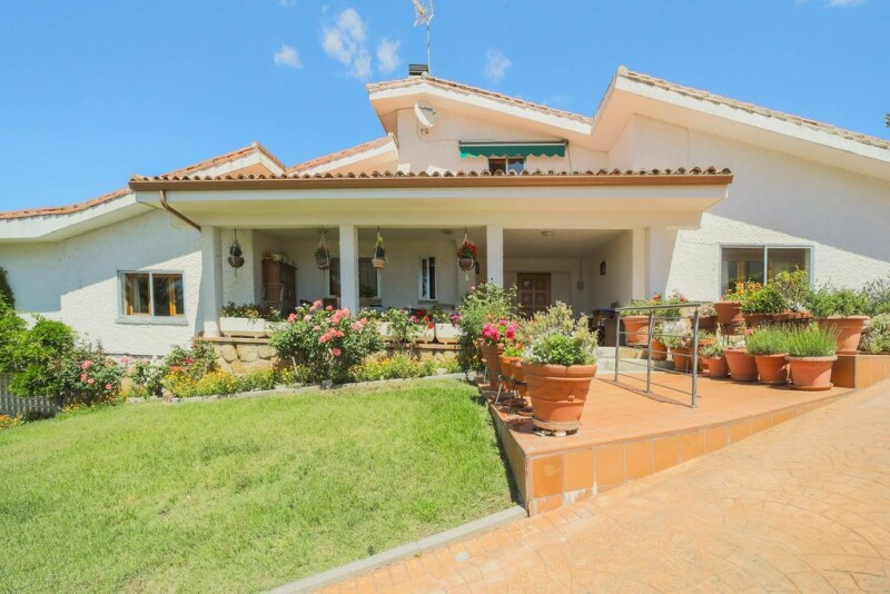 The villa is located in the urbanization of Santo Domingo, a residential housing development located 28 km away from Madrid city center and 24 minutes from Adolfo Suarez Airport. Comfortable and functional property of solid construction, with a beautiful garden and fabulous views in the best location in Santo Domingo. Thanks to its south orientation, light floods in from every corner, contributing to the feeling of comfort that the property transmits. The house, with a built area of 337 m2, stands on a plot of 1,822 m2. It has five bedrooms and three bathrooms. The distribution of the house is as follows: The main floor unfolds from a charming porch that gives access to a hall. To the right, we find a huge living-dining room with a large fireplace of about 80 m2, connected to a kitchen with a dining area completely refurbished with new electrical appliances and large storage space. To the left, a guest toilet, a service or guest room, a large master bedroom with a nice bathroom completely refurbished a couple of years ago, an office and second living room with fireplace, a glazed winter dining room, and direct access to the garden through a small staircase. All the rooms have large windows with lots of light and wonderful views of the mountains of Madrid. The first floor has two bedrooms and a complete bathroom with a hydro-massage bathtub. One of the bedrooms is very spacious, has a fireplace with cassette, and has access to a pleasant terrace. The basement (accessed through the kitchen) has an immense wine cellar with almost 3,000 bottles, distributed in three rooms, all of them decorated. Ideal for entertaining family and friends. There is also a games room and an impressive bathroom with a jacuzzi, also recently renovated. The garage (which can fit a couple of cars, although more vehicles can be parked on the entrance ramp) is currently used as a summer picnic area, with a full kitchen, fridge, and two chests of drawers. Adjacent to it there is a good sized room, which is used as a storage room but which could be used for other purposes. The garden has several rooms and some small buildings where the woodshed, a pantry, a storeroom, and the installation room are located. The swimming pool area is flat and lawned, while the wooded areas are planted with palm trees, quince trees, vines, olive trees, and rose bushes, among other species. The heating is natural gas by radiators.
