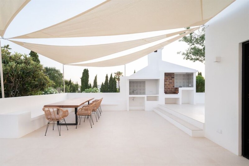 Recently renovated urban villa located at Jesus 5 min from Ibiza Town This urban villa with rental licence, currently renovated to new build standard, is located at the end of a cul-de-sac and has a lovely ground level garden in the suburb of Jesus, just 5 min from Ibiza Town. The villa has a large open plan living room with fireplace and a new Bulthaup style open plan kitchen with high quality Bosch/Gaggenau appliances including a wine fridge. The house has 5 bedrooms including a separate granny apartment, 4 bathrooms of which 3 are en suite. It has a full basement and an underground garage with space for 3 – 4 cars. An extension of the basement to a wellness area with sauna and fitness is easily possible and can be offered by us and realized for you. The separate granny annexe has a separate entrance, a kitchen and bathroom/shower/WC A large swimming pool with a solar heated outdoor shower and several terraces in the beautiful garden with orange and lemon trees, with outdoor kitchen/barbecue invite you to relax with family and friends. The villa overlooking Ibiza Town has a large roof terrace with jacuzzi and magnificent panoramic views of the old town of Ibiza and the fortress of Dalt Villa. It is fully fenced and has an electric entrance gate. The property offers all the requirements for safe living, equipped with an alarm system and a camera surveillance system. One can go shopping, have a coffee or enjoy the restaurants in Jesus for lunch or a dinner within walking distance.