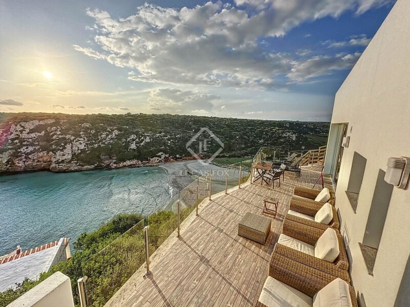 Lucas Fox presents this impressive 69 m² villa , with a modern design, located on a 313 m² plot in Cala'n Porter, within the municipality of Alaior. The property, built on the ravine, is located at a height that offers spectacular views. The property, built in 2015 and recently renovated, is in impeccable condition and ready to move into. It is distributed over three floor. Going down from the street, we access a main terrace located on a lower level. From here, the 180º panoramic views towards the beach and the Cala'n Porter ravine are simply stunning. Upon entering the house, we find a spacious and bright living-dining room integrated with the fully equipped American-style kitchen. On this same level, there are two cozy bedrooms: both with a double bed and a single bunk bed, which can comfortably accommodate up to six people. In addition, the shared bathroom with a bathtub has been renovated with modern materials, maintaining a high quality standard. Going out onto the terrace, we come to a modern rectangular swimming pool, which also enjoys spectacular views. From here, a curious wooden staircase leads us to a lower floor in the process of renovation, where we find a complete bedroom with a double bed and a single bed and a curious complete bathroom with a shower. In addition, there is another room in the process of renovation that could be converted into a fourth bedroom. On the upper floor , at street level, we have a large solarium that has the same surface area as the lower level, ideal for enjoying the sun and the views. Among the outstanding facilities of the property are cold/hot air conditioning splits, fireplace, ceiling fans and exterior enclosures with double glazing. One of the most distinctive elements of the villa is the transparent glass railing that surrounds the terrace. This detail allows you to enjoy an unobstructed view of the surroundings: the beach, the sea, the natural park and the Cala'n Porter ravine. A unique and elegant property, with exceptional details that make it an ideal place to live all year round or enjoy unforgettable stays with family and/or friends. Please contact us for more information or to arrange a visit.