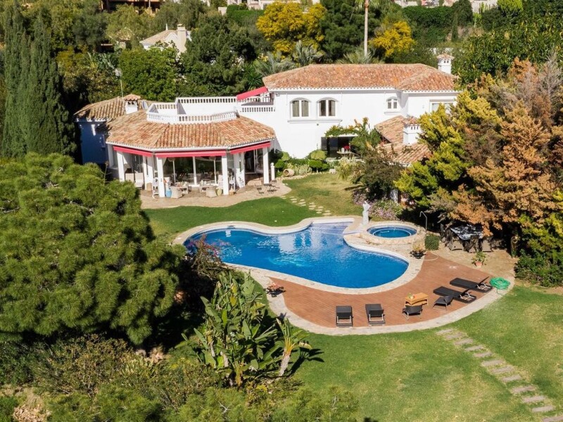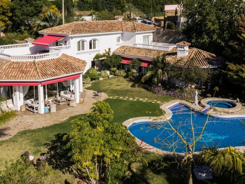 Unique 10 bedroom villa, with 2 separate apartments for sale. We have this fantastic property on offer: a villa boasting timeless design and 2 separate apartments for guests in in a prestigious area of Benahavis. When entering the main entrance, we find ourselves in a light-flooded entrance hall, with an enormous window offering views of the garden and swimming pool. This hall separates the living area from the corridor leading to 4 beautiful bedrooms, all with en-suite bathrooms. The living area consists of a large elegant living room leading out to the terrace and garden, a formal dining room and the kitchen, which is equipped with high-quality wooden furniture. On the first floor we find the masterbedroom with hardwood flooring and a large terrace, another bedroom and a large bathroom with Whirlpool bath and 2 separate showers. The lower floor boasts a garage, hamam and a gym with shower. Both apartments have 2 bedrooms, a bathroom and one of them also includes a small kitchen. The modern Mediterranean villa offers breath-taking panoramic views, over 4000 square metres of land including various terraces, a large swimming pool with jacuzzi, subtropic plants and a small vegetable garden. Located in Puerto del Almendro, a tranquil and safe area, the property is also close to San Pedro de Alcántara and Puerto Banús and you can reach Monte Halcones, with restaurants, supermarket and other amenities by foot in just a few minutes. This exceptional property is perfect if you are looking for an impressive villa with breath-taking views in a beautiful, private and safe area.