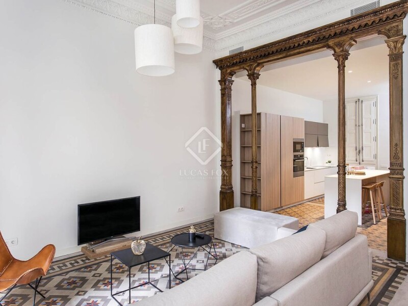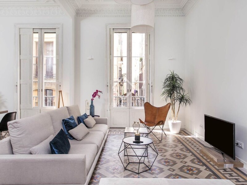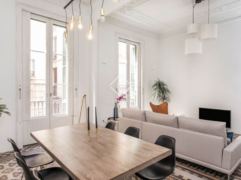 Located on the first real floor of a stunning historical building from 1910, this newly renovated apartment combines high-end modern finishes with exquisite period features, offering a truly unique living experience. With 153 m² of space, the property is thoughtfully laid out, creating distinct day and night areas. The open-plan living, dining, and kitchen area enjoys abundant natural light, thanks to large windows and two balconies overlooking the street. This area also includes a private 20 m² terrace, a rare find in the heart of the Old Town. The night area boasts three double bedrooms, two with en-suite bathrooms, along with an 8 m² patio connected to the bedrooms. Stunning period details, like mosaic floor tiles, exposed wooden beams, and intricate ceiling mouldings, enhance the apartment’s exclusive atmosphere. This one-of-a-kind property, in an unbeatable Barcelona location, offers a rare chance to own a piece of history with modern luxury and a private terrace, ideal for those seeking a unique and prestigious residence in the city.