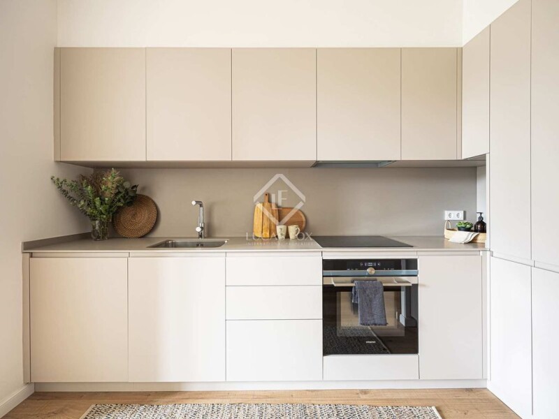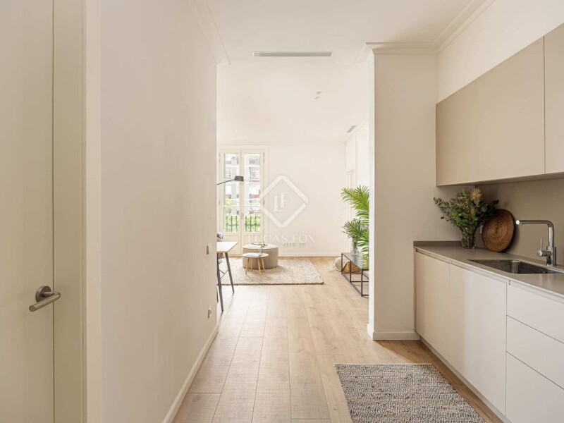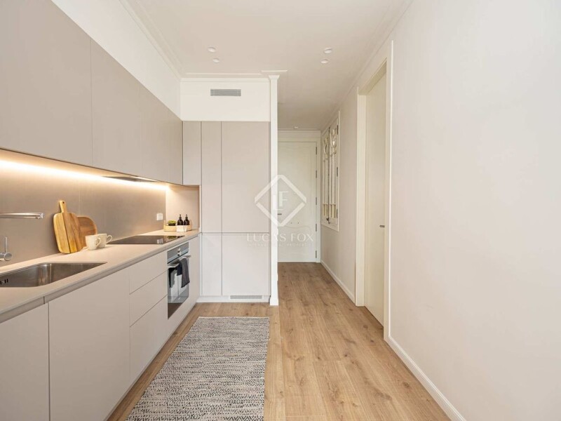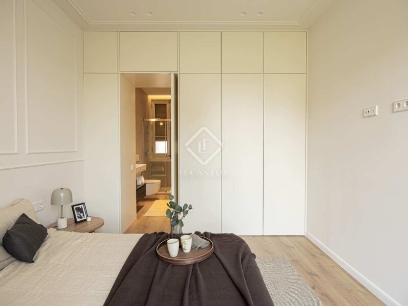 87 m2 exterior apartment on Gran Vía de las Cortes Catalanas. This property, recently renovated with the best qualities and finishes, is located on the upper floor of a period building with an lift . It consists of a spacious, very bright dining room living room with access to a balcony, an exterior double bedroom with a balcony and private bathroom, two additional double bedrooms and another full bathroom . All bedrooms are equipped with built-in wardrobes. It has a modern and efficient open kitchen, with a comfortable and functional design, which contrasts with the traditional. Its quality finishes adapt to the space and it is equipped with all Bosch brand appliances . In addition, a practical utility room with a utility area and installation of hot-cold air conditioning throughout the property is included.