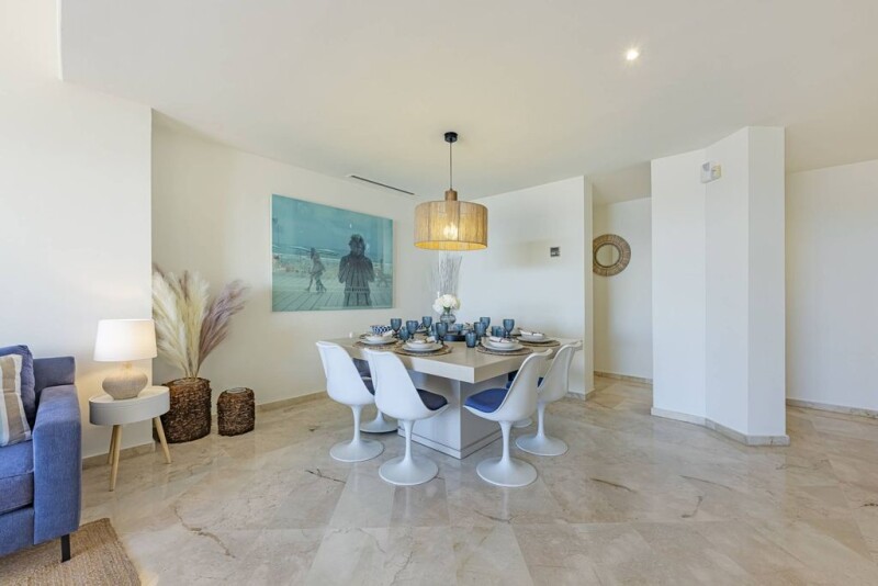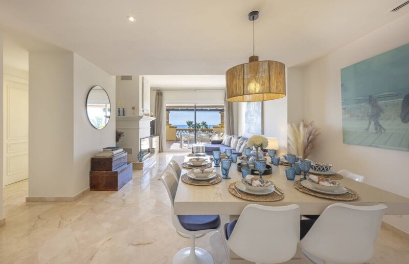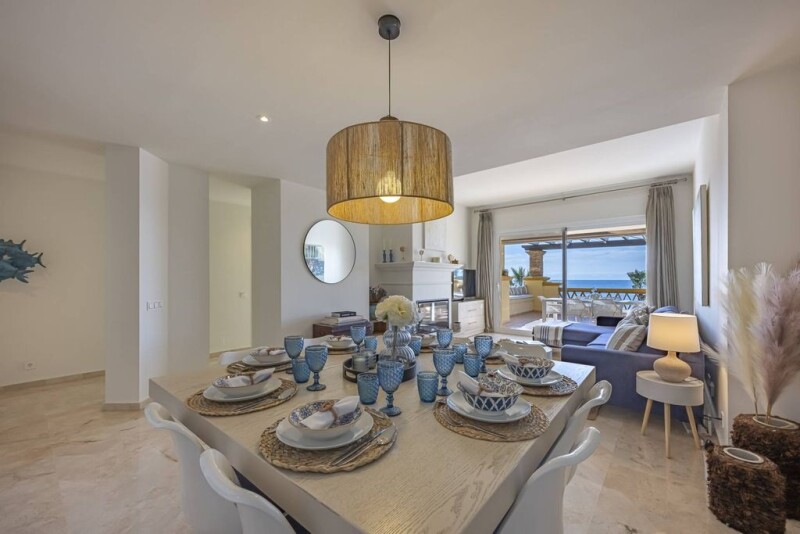 Exquisite frontline beach apartment in Río Real, Marbella Located in the prestigious Río Real Playa community, this stunning three-bedroom beachfront apartment offers breathtaking panoramic sea views and an unparalleled coastal lifestyle. Nestled alongside the renowned Río Real Golf Course, this prime location in Marbella East provides residents with privacy, exclusivity, and direct beach access. Just a short stroll from Trocadero Beach Club and within easy reach of luxury golf and resort amenities, this property is ideal for those seeking both tranquility and convenience. Bathed in natural light, the apartment features a spacious open-plan living and dining area with floor-to-ceiling windows that connect seamlessly to a 45 m² south-facing terrace, perfect for al fresco dining while overlooking the Mediterranean. Two of the three generously sized bedrooms enjoy direct sea views and en-suite bathrooms, while the third bedroom boasts a private terrace. The fully equipped kitchen offers modern appliances, ample storage, and a separate laundry room. Additional highlights include air conditioning, electric shutters, built-in wardrobes, and double glazing for year-round comfort. Set within lush tropical gardens, the Río Real Playa complex features two communal swimming pools, one of which is heated, enhancing the resort-style living experience. The property also includes a private underground parking space and two storage rooms, with courtesy guest parking available. Just 30 minutes from Málaga International Airport, this secure gated community offers an exceptional opportunity to experience luxurious beachfront living in Marbella East.
