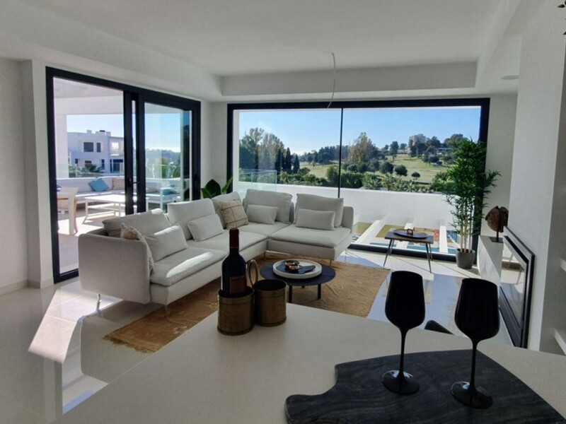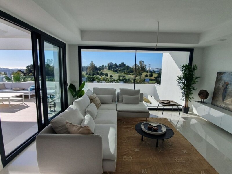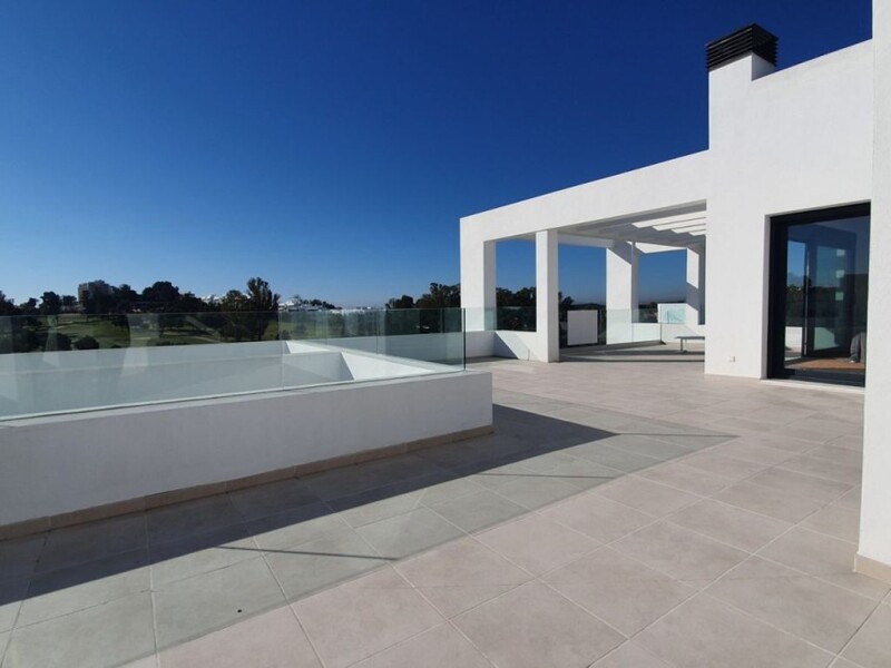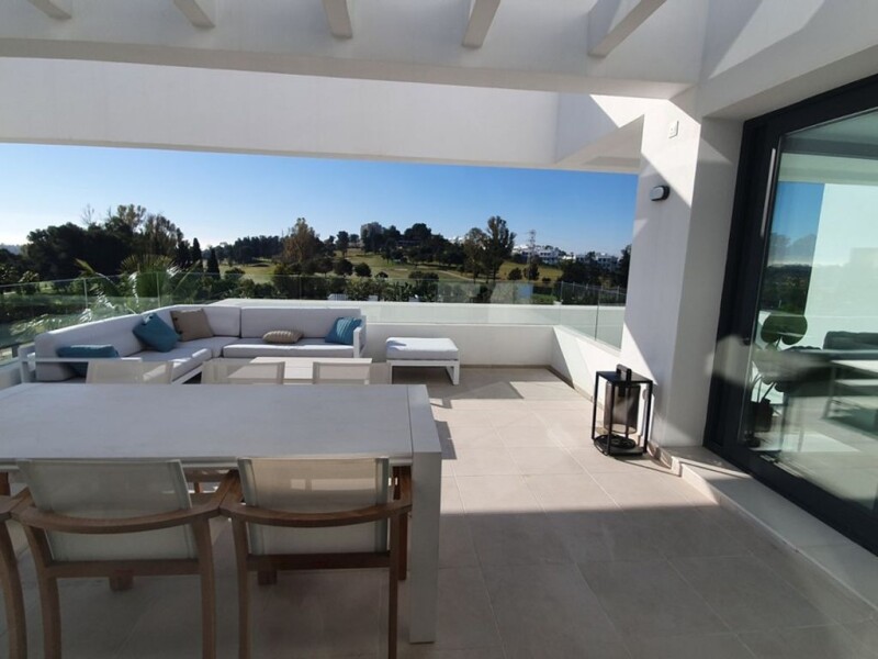 In this golfers Paradise we offer this fully furnished 3 bedroom duplex penthouse, southwest orientated, with absolutely outstanding views of the Atalaya golf course and the Mediterranean Sea. This exclusive Duplex penthouse is bright with spacious living areas and large windows opening to the terraces, designed to make the best use of the natural light, bringing together interior and exterior spaces. From the living room through the non-framed glass terrace your eyes will be drowned to the spectacular panoramic views of the golf course towards the sea. The large terrace to the side can be accessed through the living room as well as by the two bedrooms on this level. The kitchen is equipped with all modern appliances. An electric operated fire place gives that luxury feel in winter times. Entering the home a proper hallway with large windows to the double high ceiling welcomes you. A perfectly situated fitted wardrobe under the staircase is there for storage, washing machine and dryer. On the top floor is the master bedroom with walking closed and master bathroom. Waking up in the morning with again this view is not a punishment. Through the master bedroom as also separate from the upstarts hallway the roof terrace can be accessed. A lovely place for entertaining family and friends. The selection of materials has been carefully studied, high quality finishings ensure the most comfort in lifestyle. The apartment is offered as seen and benefits of two connect parking spaces (without pillars) and a large storeroom. The communal area offers large landscaped gardens, 4 swimming pools, a paddle court and leisure area with barbecue. Located in a well-established area of Estepona near Benahavis, home to more exclusive property developments and a growing number of new villas.