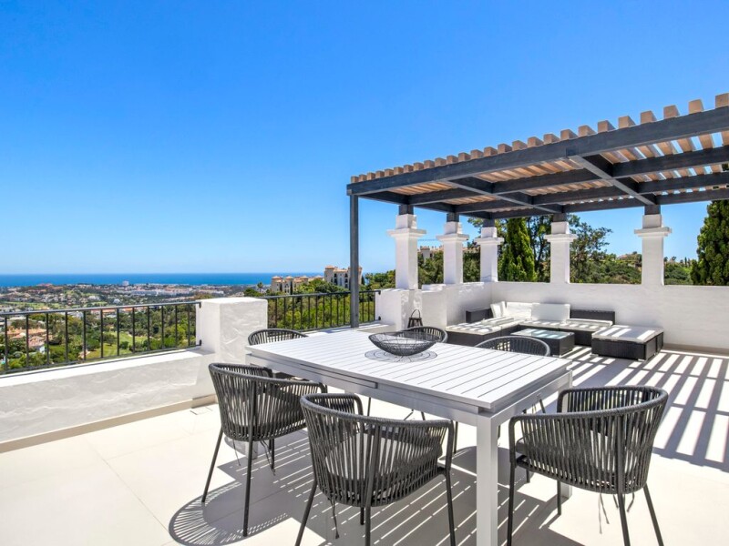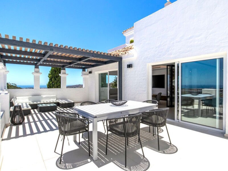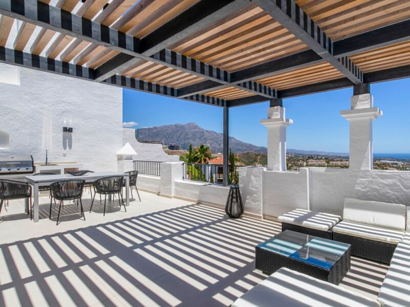 Duplex penthouse beautifully renovated and with impressive panoramic sea views from both levels. Located in a gated community in Benahavis, next to La Heredia, just a few minutes drive from the beach and Puerto Banus. This modern property consists of 3 bedrooms and 2 bathrooms. The main floor consists of an open plan kitchen connected to the dining area and living room, including a transparent wine cellar dividing these two spaces. Open up the sliding doors to a spacious terrace with a BBQ area, overlooking the Mediterranean coast. 2 bedrooms and 1 bathroom are located on this same floor. The top floor is the master-suite, with an open plan bedroom and bathroom and including it's own private wooden-deck terrace with a sauna and outdoor shower. The stunning views cannot be missed from here. The complex is gated, with well-kept gardens and a communal pool.
