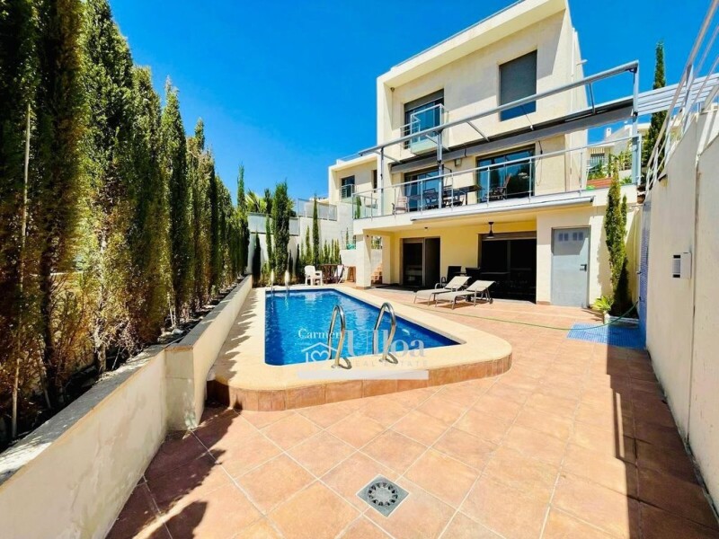 INDEPENDENT CHALET OF 210M² IN PUEBLO ACANTILADO, CAMPELLO~~This 210m² property, located in Pueblo Acantilado - Lanuza, just 100 meters from the sea, features 4 bedrooms spread over 3 floors. One of these floors, the independent ground floor, is adapted as a separate dwelling, ideal for renting out and thus making the property more profitable.~~The independent ground floor includes its own pool, a spacious and bright living-dining room with an integrated and fully equipped kitchen, as well as an independent double bedroom and a complete bathroom.~~On the main floor, there is another spacious living-dining room and a fully equipped, independent kitchen, along with a terrace offering stunning views. The three bright double bedrooms are distributed over the two upper floors, accompanied by two full bathrooms—one with a shower and the other with a bathtub, making it ideal for families.~~The chalet is equipped with solar energy, air conditioning, and electric water heaters. It also features a large terrace with a BBQ, high-quality outdoor furniture, internal parking for two vehicles, and visitor parking spaces for two more cars.~~Enjoy an impressive sea view from this exclusive chalet.~~#### Key Distances:~- Benidorm: 27 km~- Cala de les Palmeretes: 550 m~- Cala Lanuza: 1.1 km~- Alicante Airport: 36.9 km~~For more information and to schedule a visit, please do not hesitate to contact us. We are at your disposal!~~This description is for informational and descriptive purposes only and does not constitute a binding offer.~~Professional Real Estate Agent number 692~Real Estate Agents Registry of the Valencian Community 1862.