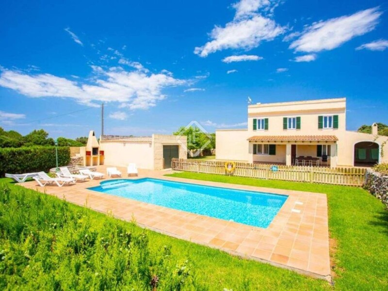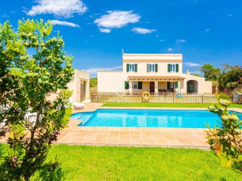 Typical Menorcan country house of 245 m² built, plus 400 m² of buildings for agricultural use on a plot of approximately 300,000 m², located in a privileged location a short distance from the virgin beaches of Menorca and with unobstructed views of the countryside. The property is distributed in two floors. On the ground floor, we find a cosy covered porch overlooking the pool and a barbecue area, a kitchen with a separate dining area, a utility room / storage room, a living-dining room with a fireplace, a double bedroom, a triple bedroom and a bathroom. The first floor houses four double bedrooms and a bathroom. The house enjoys high ceilings with exposed wooden beams, air conditioning units and heating. On the land we also find some 400 m² of outbuildings for agricultural use. The farm has a tourist licence for 13 people, electricity connected to the network and a legal well. Outside we find a beautiful 46 m² pool in front of the house surrounded by a large terrace, a garden area with native trees and an area for agricultural use. Undoubtedly a house in the country perfect to enjoy summer nights on the terrace, spending seasons with family and friends, or renting it for tourist use. Please contact us for more information or to arrange a viewing.