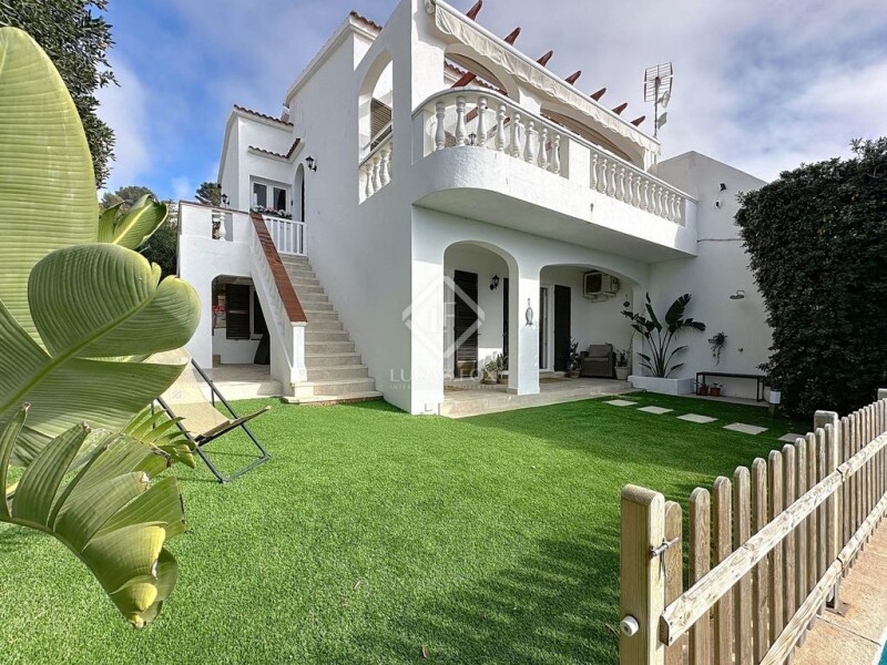 Lucas Fox presents this beautiful villa with a 135 m² garden on a 340 m² plot in the Torre Soli Nou development , Son Bou. The property is presented in perfect condition, recently renovated with great taste and style, with an incredible location, as it is located in the upper part of the development, which allows you to enjoy incredible views from the large terrace towards the famous Son Bou beach. The property is distributed over two floors. From the entrance at the same level as the street, we reach the spacious and bright living-dining room that has direct access to the terrace through a large sliding window that allows you to see the sea from any point in the room. On this level we also find a large fully equipped kitchen and a toilet with a built-in wardrobe with a hidden washing machine. On the lower floor there are three double bedrooms, one of which is currently used as a study. The bedrooms have air conditioning and heating and share a full bathroom with shower. Two of the bedrooms have direct access to the beautiful and spacious garden with private pool and sea views. Exterior we find a well-kept garden and a private swimming pool. An ideal property to live in all year round or spend time with family and/or friends. Please contact us for more information or to arrange a visit.