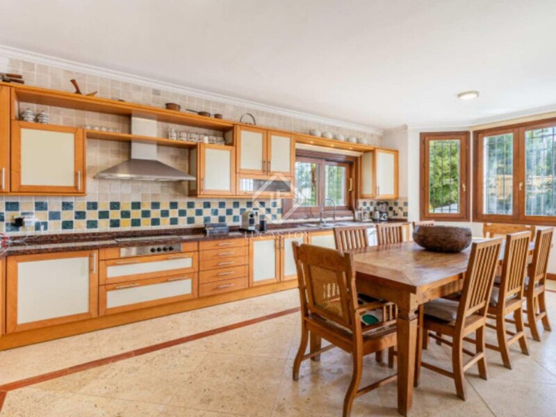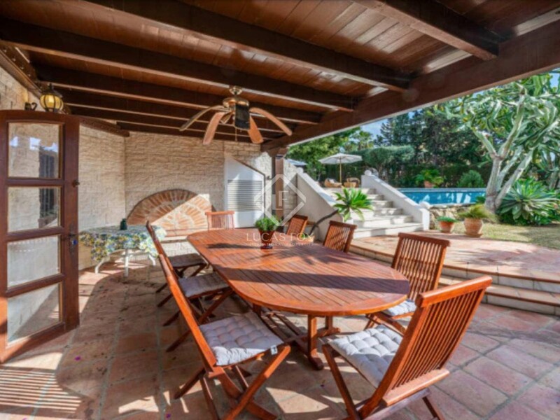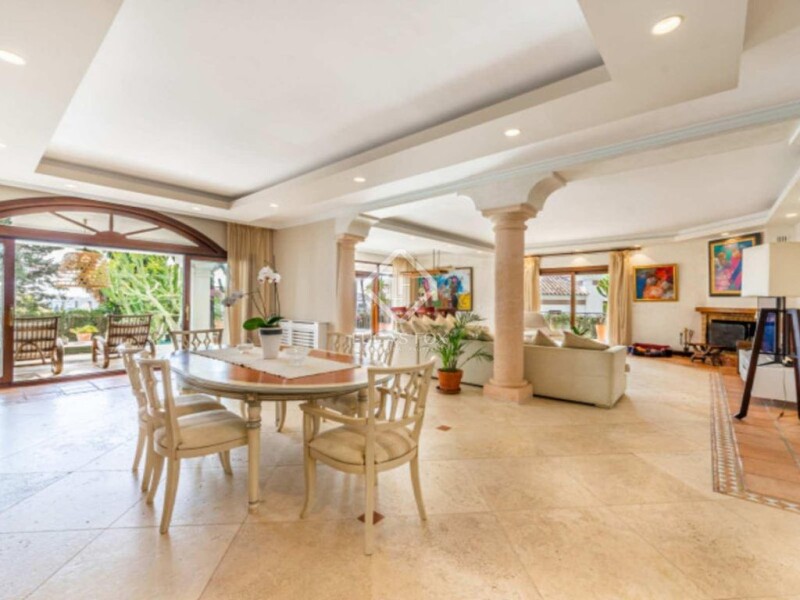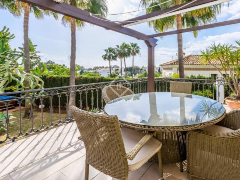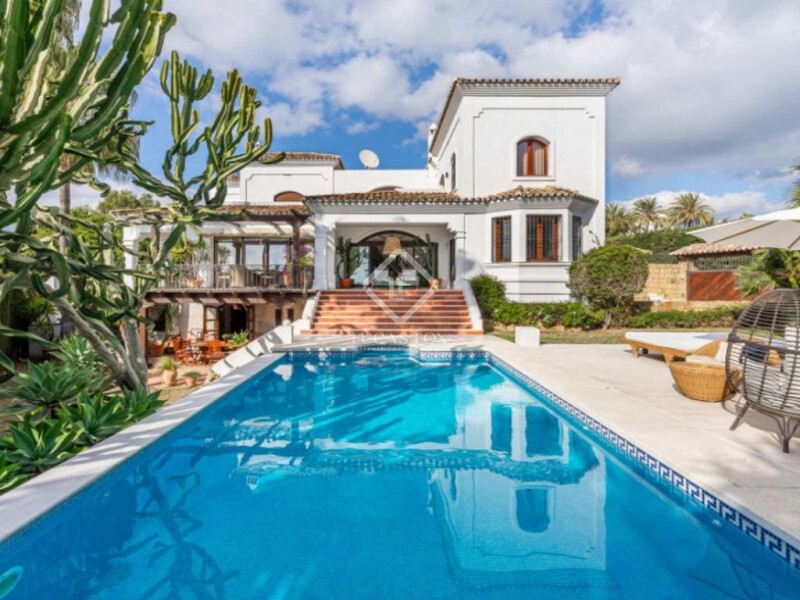 This traditional style luxury villa for sale is located in the prestigious area of Nueva Andalucía, one of the most attractive, green, and sought-after areas of Marbella, close to all amenities, at approximately 900 m from the beach and Puerto Banus. Distributed on 3 levels with 732 m² built on a plot of 1.008 m², this property enjoys a south orientation and views of the Mediterranean Sea. The accommodation comprises an elegant entrance hall with an exquisite marble staircase and a guest toilet, an office, a spacious lounge, and a dining room, both warmed by fireplaces. The living areas have an exit to the covered porch and further to the garden with impressive cactus trees, a private swimming pool, and sunbathing areas. A fully fitted, beautiful kitchen with a breakfast area is equipped with top-quality Bosch appliances and connected to the dining room. A bedroom suite completes the ground level. The upper floor hosts 2 more bedrooms sharing a shower room and a master suite with a nice dressing area, a jacuzzi, and a shower. All the bedrooms upstairs have access to the large south-facing terrace with lovely sea and mountain views. The basement features a wine cellar, a staff bedroom with a shower, and a spacious entertainment room with a fireplace, a bar, and exit to the covered terrace with barbecue facilities. A garage for 2 cars, laundry room and a carport for 1 car complete this level. This high-end house has everything you need to enjoy the privileged Mediterranean lifestyle, including covered and sunny terraces with chill out and al fresco dining areas, a saltwater swimming pool and a separate jacuzzi. You will like the beautiful and calming classic interior design style, where nature dictates the elegant colour palette. Superb natural materials (creamy marble, wood, terracotta tiles) and time-honoured artisanal elements go hand in hand with modern features. Delivering exceptional style and attention to detail, the gorgeous property is for sale in excellent condition, with many luxurious features: air-conditioning with heat pump, oil central heating, fitted wardrobes, double-glazing, window security bars, glass doors, etc.