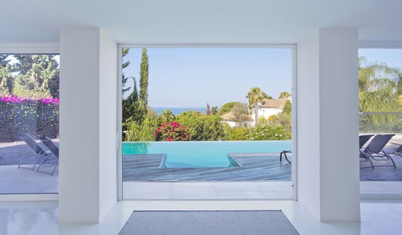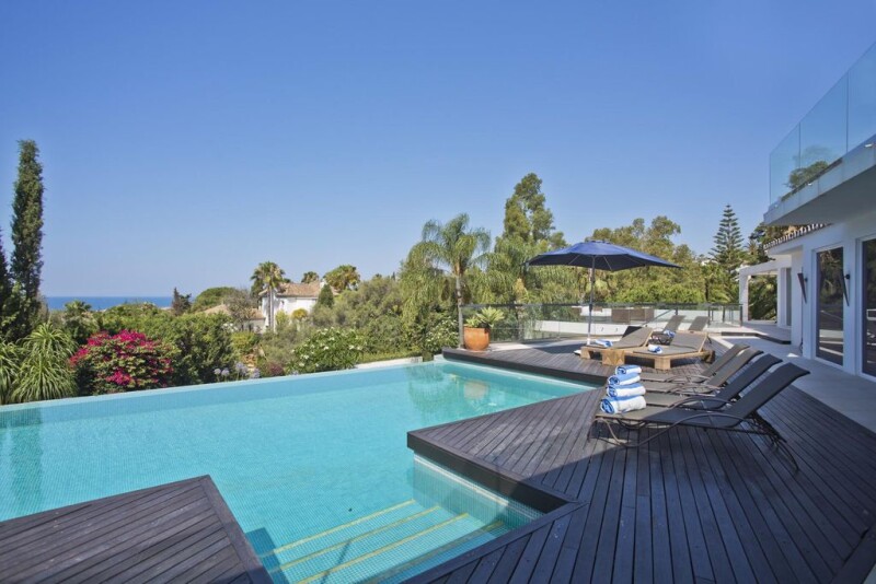 A stunning 7-bedroom villa has come onto the market in the desirable residential area of Hacienda Las Chapas to the east of Marbella. The impressive villa sits in a plot of 2,637 m2 in an elevated location, enjoying stunning panoramic views across exuberant tropical gardens, limpid infinity pool and a carpet of green, wooded area all the way down to the glistening Mediterranean beyond. The villa extends over 554 m2 of impeccable contemporary living space, plus 210 m2 of terraces, opening up the entire property with vast floor-to-ceiling windows overlooking the limpid waters of the infinity pool and the green vistas which surround the entire property. Fully renovated and recently-refurbished, the home exudes modern minimalist luxury. Created with leisure in mind, this property is ideal for holidays and entertaining in style. Built over 4 levels, as you enter the home through the attractive wooden gates and front door, you have your first taste of the fabulous views through a wide stretch of picture windows which open out to the infinity pool and wooden-decked solarium complete with glass balustrades to maximize the views. Perfectly adapted to the modern Mediterranean lifestyle on offer in Marbella, the architecture beautifully blends the interior and exterior areas of the villa. On this ground level you find several serene bedrooms with on-trend bathrooms en-suite. Built to the highest specifications, all the bedrooms are spacious and include quality fitted wardrobes and luxurious beds. One of the bedrooms on this floor has a superb round bathtub – the bathroom suite is by Villeroy & Boch and thanks to tinted glass walls, you can appreciate the pool and garden views while taking a bath. All the sumptuous suites on the ground floor are but a few steps away from the inviting infinity pool and sublime garden and sea views. To the right of the main entrance you come to the light, bright and extra spacious kitchen. The heart of the home, this kitchen is perfect for those who love to cook and entertain. Equipped with professional level fridges, wine cooler, freezers and ovens, the main focus is the extended island with attractive wooden work top. Adjacent to the kitchen is an elegant dining room with cosy lounge area. Complete with a large skylight, the pristine white kitchen enjoys an abundance of natural light from dusk ‘til dawn. The kitchen has stunning views to the pool and gardens, while opening out to a barbecue area with spacious al fresco dining area and an open-air lounge on a further area of wooden decked terrace – the perfect place to enjoy a sundowner or an after-dinner drink with friends. The first floor of the villa is devoted to a show-stopping Master suite with a large terrace running the length of the property from which to enjoy the simply stunning views. Spread over the entire floor, the suite takes in a luxurious lounge and TV area, a glamorous bar, a sumptuous bedroom with ultra luxurious bathroom – and a very smart dressing room this suite is on a par with a deluxe suite in a chic 5-star hotel. Taking a further staircase up, you come to the top floor of the villa which is dedicated to a very large roof terrace. Again, with glass balustrades, the views from here are simply spectacular. The perfect setting for parties and entertaining or ultra private sunbathing, this roof terrace is also the place to enjoy the spectacular golden Mediterranean sunsets. The lower ground floor of the villa is devoted to leisure, including an indoor heated swimming pool with water jets, steam room, relaxation area, guest bathroom, gym, table-tennis/games room with bar, laundry and linens room. Stepping outside from this area you come to lawns and a Jacuzzi, next to the waterfall area of the infinity pool. A stretch of lawn, hidden by trees could be made into a private vegetable garden or small sports pitch or play area. Also on the lower ground floor, enjoying privacy and garden views is a complete 2-bedroom guest/staff apartment with kitchenette and bathroom. Within the recent renovations of the property, the villa now has air-conditioning and underfloor heating throughout. With excellent rental potential, the villa can be rented for holiday lets for 20,000€/week. With two entry gates, the villa can accommodate 4-5 cars in the driveway. With security doors, security cameras and alarm system, the area of Las Chapas also has excellent 24-hour security. The area of Las Chapas is a very well-established neighbourhood of substantial properties. Replete with greenery, the area is tranquil while being within easy reach of the beach, shops, restaurants and all amenities. Just a 10-minute drive to Marbella town, this spectacular villa is ideal for dream living or holidays in the resort.