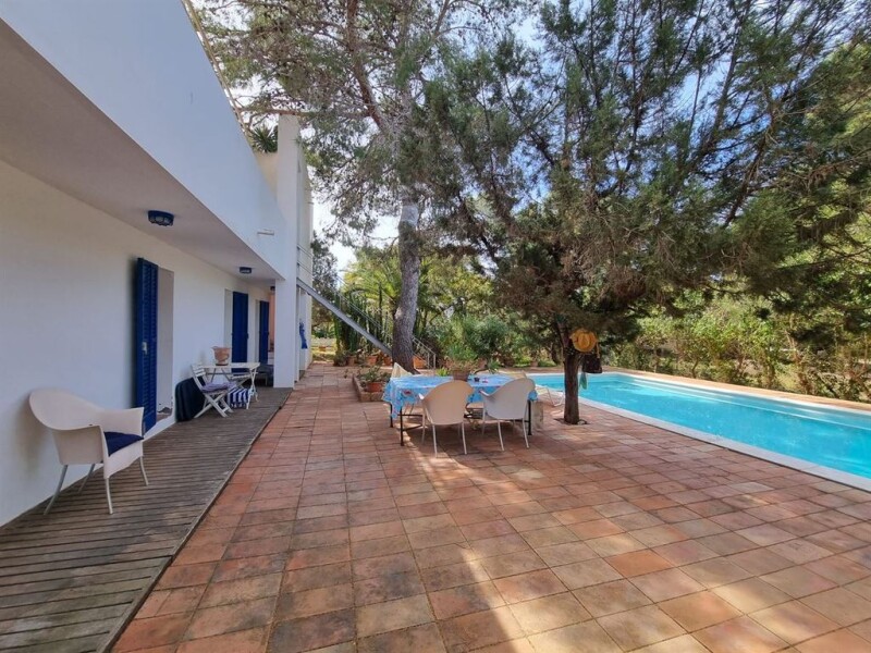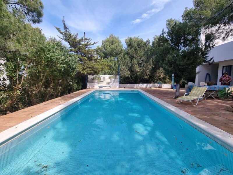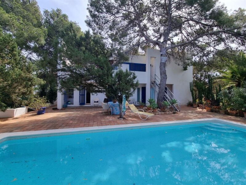 Iconic cubist Villa in Cala Vadella with lots of potential - close to the beach Nestled in the picturesque coastal village of Cala Vadella, this original white island designer gem stands as a testament to contemporary architectural elegance. Revered in international magazines and architecture books and magazines, this stunning residence is poised for renovation, ready to once again captivate with its minimalist cubic design and meticulously defined lines. Situated over two levels, the house boasts an array of unique features, including designer taps by Philip Starck. Upon entering through a charming patio, guests are greeted by three bedrooms and two bathrooms on the ground floor, with the potential to create an additional bedroom with an en-suite bathroom in the annex building. Ascending to the first floor reveals an inviting lounge/dining room adorned with Venetian shades that delicately shape the sunlight, creating an ambiance of serene tranquility. A separate kitchen opens onto an outdoor dining terrace, offering an ideal setting for alfresco gatherings. Ascend the stairs to the rooftop, where a sunny chill-out lounge awaits, providing panoramic views of the surrounding landscape. Outside, a private huge swimming pool beckons for refreshing dips, while the lush garden, adorned with beautiful trees, offers a serene escape. Secure parking for four cars is provided on the property, ensuring convenience and peace of mind for residents and guests alike. Beyond the confines of this exquisite abode, the azure waters of Cala Vadella beckon, just a five-minute stroll away. Explore nearby beaches such as Cala Bassa, home to the renowned CBBC Beach Club, or Cala Conta, where the iconic Sunset Ashram awaits. For those seeking culinary delights, the charming village of San Josep is a mere four kilometers away, offering an array of restaurants, shops, and amenities. Conveniently located just 15 minutes from the airport and 20 minutes from the bustling streets of Ibiza Town, this unique property offers a harmonious blend of serenity and accessibility, making it an idyllic retreat for discerning individuals seeking the epitome of island living.
