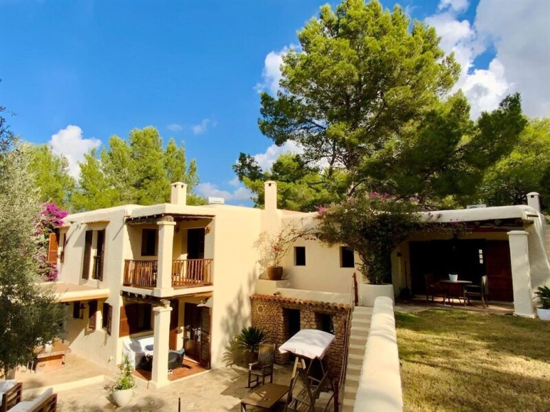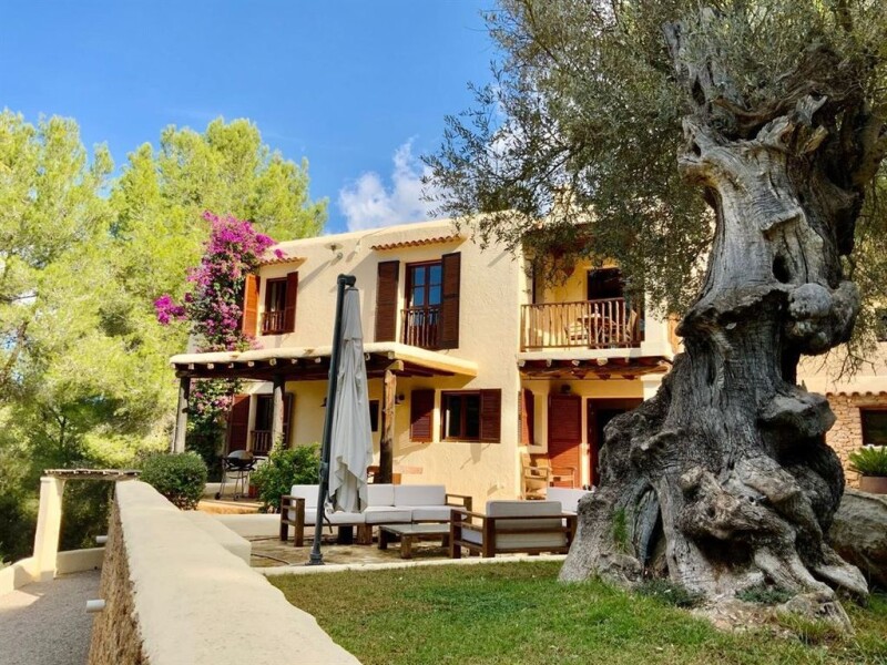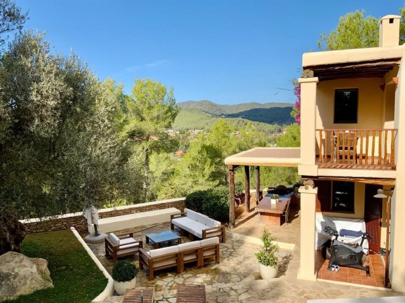 Spacious villa in attractive Ibizan style for sale near San Rafael This spacious villa in attractive Ibizan style is located in the middle of nature in a very quiet area near San Rafael. The large property of 15,073 m², of which approx. 7,000 m² is fenced and is registered with 2 separate land registry numbers, offers many possibilities as a plantation, children's or horse park and perhaps you can also build a guest house there. But this needs to be clarified. Directly on the property we find a spacious parking lot for parking several cars. The 2 double garages with a total area of almost 200 m² offer further protected parking possibilities for about 6 cars. The water and electricity supply as well as a utility area are also located here. This area could also be used for other purposes, such as storage room, home cinema or gym. In the 2-storey main house there is a comfortable living room with dining area, separate kitchen with access to the outside area, pantry, 3 bedrooms, 2 bathrooms and a guest toilet on the first floor. A beautiful covered terrace with Sabina wood next to the main entrance is ideal for pleasant stays with beautiful views of the green. The wood stoves in the living room in the dining room and kitchen create a cozy feeling on this floor. - On the second floor there is another reading room or TV room with a brick sitting area and access to a covered terrace with a beautiful view of the garden. In addition there are 2 bedrooms, a bathroom and a guest toilet. A guest apartment can be accessed from the second floor of the main house as well as via a separate entrance. There is a living/dining room, a small kitchen, 2 bedrooms, a bathroom with a bathtub and a partially covered terrace. Ceilings with beautiful Sabina wood beams inside and outside emphasize the Ibizan style. On the opposite side of the house there is a separate guest room with shower-bath and a terrace with a lovely view of the own garden with native plants. The carefully designed garden has been created with native plants, easy to care for and with great attention to detail. A lovely property, which is a wonderful place to enjoy your holidays due to its unique tranquility. On the adjacent plot another house can be built - a very attractive investment! Main features: air conditioning oil central heating double garage double glazing guest apartment swimming pool solar energy terraces underfloor heating wood carpentry.