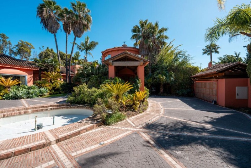 Gorgeous mansion for sale in the heart of the Golden Mile, Marbella Discover this Mediterranean-inspired estate nestled within the prestigious residential enclave of Nagüeles, enveloped by lush sub-tropical gardens within impeccably manicured grounds. Set against the iconic La Concha mountain backdrop and offering glimpses of the sea, this sophisticated residence beckons you through a captivating courtyard entrance featuring a graceful fountain centerpiece, ample guest parking, and a separate carport accommodating at least three vehicles. Spanning two expansive floors, the mansion boasts a harmonious layout. The ground floor unfolds to unveil a luminous hallway leading to a grand living room. Adorned with vast sliding glass doors framed by Moorish-style pillars, this space is bathed in natural light, further accentuated by a mirrored ceiling section above the sitting area, creating an inviting ambiance. Adjacent to the living room, a cozy library provides a serene retreat for lounging with a favorite book or crafting literary works. Bathed in sunlight filtering through large windows, this sunlit haven offers views of the picturesque gardens. A separate dining room features panoramic views of a tranquil pond and verdant surroundings through expansive glass windows. The kitchen, cleverly divided into two sections with a breakfast area, is fully equipped with ample storage space. Enhanced by recessed lighting and natural illumination through sizable windows, these spaces exude a bright and airy atmosphere. The main level also houses the luxurious master bedroom with an opulent en-suite bathroom, featuring a sunken bathtub, walk-in shower, double vanities, and a private dressing room with direct access to the lush gardens. Additionally, there are three lavish bedrooms, each boasting private en-suite bathrooms and abundant natural light streaming in through large windows. The upper floor features a unique spheroid-shaped turret housing a private study or office, flooded with natural light through floor-to-ceiling glass windows and doors. A dramatic terrace overlooks the gardens, swimming pool, and offers serene sea views. Outside, the property showcases a distinctive curved swimming pool surrounded by slate-tiled elegance, embraced by tall palm trees and lush greenery, creating a secluded oasis. A gazebo overlooking the pool, complete with day beds and sun loungers, sets the stage for relaxation and tranquility. Ideal for a large family, this property exudes a welcoming charm that embraces lively gatherings and joyful moments. If you seek a heavenly retreat, don't miss the opportunity to explore this ornate and majestic mansion nestled in the heart of Marbella.