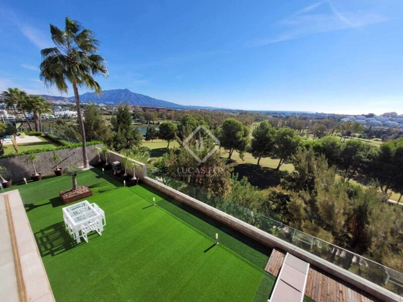 First line golf villa with wonderful views of La Concha Mountain, the sea and golf course. This cosy quality villa represents the perfect family home for those who would like to live in a peaceful location. The villa is built over 3 levels. The ground floor offers an entrance hall, a living room with fireplace, a dining area and a separate kitchen – all with direct access to the terrace and the garden. The second floor offers a Master Bedroom en-suite and 2 guests bedrooms with bathrooms. This level enjoys incredible views over the mountains and the sea. The lower level has independent access from the garden, and it offers a separate bedroom en-suite (which can become a perfect staff or guests studio), a laundry area, storage area and an unfinished basement space. The garden area is covered by artificial grass, which makes it very easy to maintain. From the garden you can access an independent glass gym room on the upper floor. Its most amazing views will keep you entertained. The pool is located in the perfect spot as it has sun during all day long. It is also heated for those who like to have a swim on the coolest days. There is a private parking space for 2 cars.