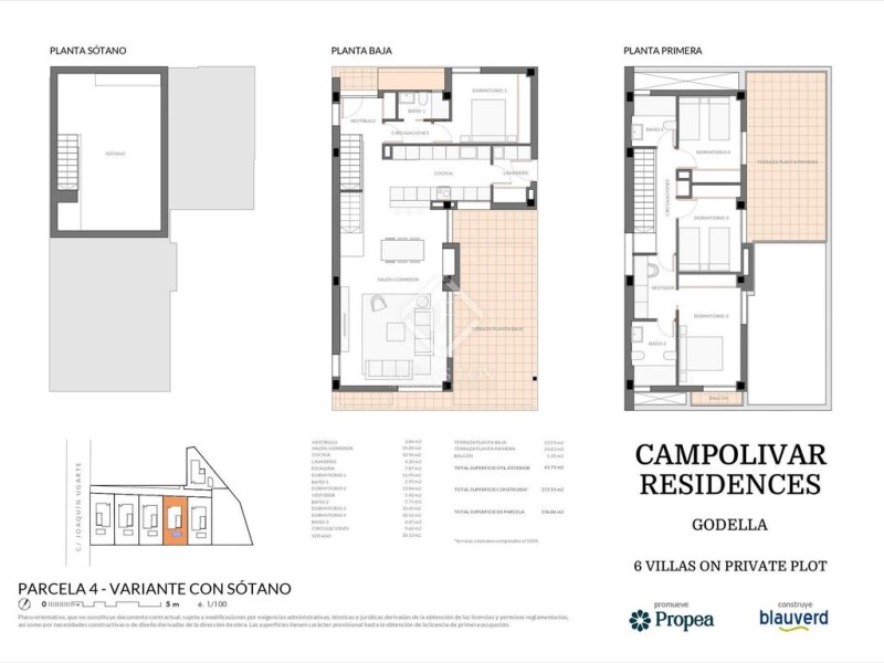 This property is part of the Campolivar Residence development , a new build of an exclusive residential complex of six luxury single-family villas. The villa has a total constructed area of 272.53 (with basement option) and 233 square meters (without basement option), and sits on a plot area of 536.86 square meters. It consists of a ground floor, first floor , and basement (optional). On the ground floor there is a spacious dining room living room with access to a terrace, the dining room living room leads to an open-plan equipped kitchen, next to the kitchen a utility room. The ground floor is completed with a double bedroom with an en-suite bathroom and a lobby that corresponds to the main bedroom, from which you can access a balcony. The first floor consists of three double bedrooms, one of them with an en-suite bathroom and an open dressing room, another full bathroom serves the other two rooms, from two double bedrooms there is access to a private terrace. Optionally, a floor of approximately 30 m² ventilated with natural light through a skylight is offered. Among its features, it is worth highlighting the homes' porcelain stoneware flooring, floor-to-ceiling white lacquered interior doors, white lacquered wardrobes with wood interior paneling, and a reinforced security property door. The homes also feature Cortizo aluminum frames with thermal break, Climalit-type double glazing, and safety glass exterior and interior railings. The bathrooms are tiled with high-quality porcelain stoneware by Pamesa or similar, and sanitary ware with concealed flush cisterns by Duravit or similar. The kitchens are equipped with built-in appliances : an induction cooktop, electric oven, and built-in microwave, as well as a refrigerator, dishwasher, and washing machine, all by Bosch or similar. The homes feature high energy efficiency: a ducted air conditioning system for heating and cooling, hot water supplied by aerothermics , and an Airzone system. They also have a home automation system to control lighting and air conditioning. The following options will be available free of charge: replacement of shower for bathtub, two kitchen cabinet and countertop colors, and two tiling options. Additionally, the following options are available for a fee: installation of a pellet-burning cassette fireplace , underfloor heating heating, photovoltaic installation on the roof, water softener, and the addition of SIMON 100 series automated electrical systems. Contact us for more information.