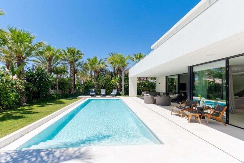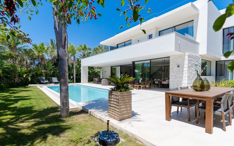 Fabulous villa with brilliant panoramic views for sale in Marbesa, Marbella This stunning luxury villa is located in the desirable area of Marbesa, in Marbella East. With 6 (4+2) bedrooms and 6 (5+1) bathrooms, this spacious property offers ample space for a large family or for entertaining guests. The villa spans across a built area of 340m² and sits on a generous plot of 810m², ensuring plenty of room for outdoor living. As you enter the villa, you are greeted by a grand entrance hall that leads to a bright and spacious living room, perfect for relaxation and socializing. The villa boasts a fully furnished dining room, where you can enjoy delicious meals with family and friends. The kitchen is open plan, perfectly equipped with all top Gaggenau appliances, it will become your personal cooking oasis with all you need including a champagne cooler and coffee corner. The large windows throughout the property provide breathtaking sea views and flood the rooms with natural light. The villa features a private terrace, overlooking the beautifully landscaped in a tropical manner private garden and an incredible, fantastic pool area with sun deck. Whether you want to take a refreshing dip in the pool or simply soak up the sun on the terrace, this outdoor space offers the perfect retreat. Additional features of this luxury villa include air conditioning, an ethanol fireplace for cosy evenings, a guest room for visitors, a storage room, and a gym for those who enjoy staying active. The property also has an alarm system for added security and a solarium for enjoying panoramic views of the surrounding area. Conveniently located close to amenities, transport links, shops, and schools, this villa offers the perfect balance of tranquillity and accessibility. With its prime location near the beach and golf courses, you can enjoy the best of both worlds - a peaceful retreat in a luxurious setting, while still being within easy reach of all the attractions and amenities that Marbella has to offer. Whether you are looking for a permanent residence or a holiday home, this brand-new villa is sure to impress with its idyllic combination of both luxury design and natural elements, all incorporated with high-quality materials.