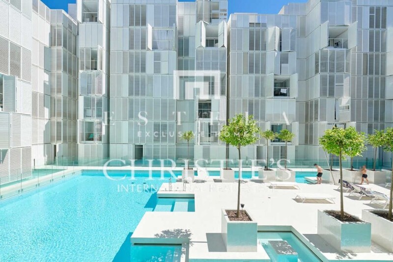 Fabulous Apartment in Patio Blanco Building, Marina Botafoch, Ibiza. Mediterranean inspiration and lifework from “Life Marina Ibiza”, by famous architect Jean Nouvel. It is located in the heart of Marina Ibiza. The building resembles an Italian theater and its front facade is covered with greenery and colorful flowers. The Patio Blanco building is inspired by the lifestyle of a traditional Andalusian patio. The exterior has similarities to typical Ibiza houses, such as white walls with small windows. Botany is very essential for the design of this building. One of its walls is a giant vertical garden with bougainvillea and jasmine. At night the patio and its integrated pool are beautifully illuminated. It also has a community sun deck on the rooftop with sun beds, showers and great sea view. From the comfortable underground garage you have direct access by lift to the apartment, the pool and the roof top. The building has 24 hours security, a large swimming pool with a patio of orange trees and a solarium with amazing sea views. It is located just minutes from the city of Ibiza, Talamanca beach, famous restaurants, trendy boutiques and the main accesses to the rest of the island.