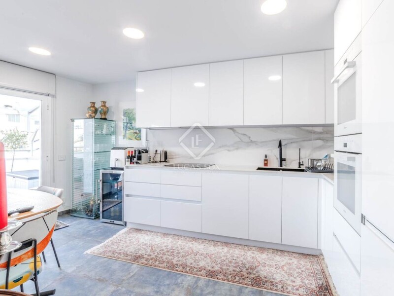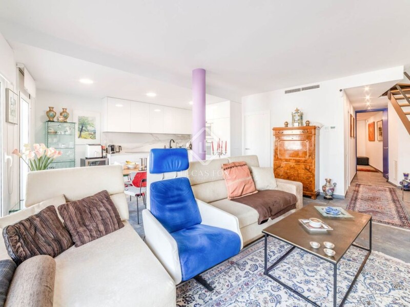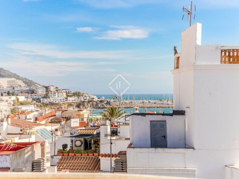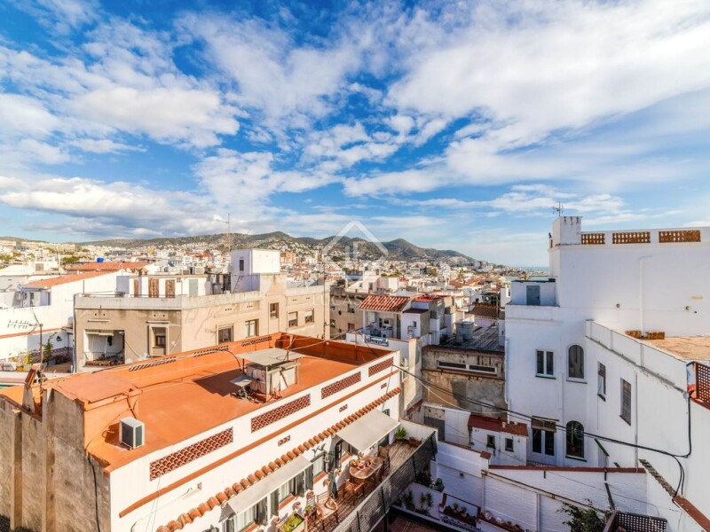 This spectacular duplex penthouse is situated in the heart of Sitges, on a quiet semi-pedestrian street, offering an unbeatable location just moments from all essential services, including restaurants, cafés, supermarkets, a medical centre, and only two minutes walk from the beach. The building is home to an exclusive small community, and features direct access to the car park next to the main entrance. A wide white marble staircase and lift that leads up to the elegant duplex penthouse. Upon entering, a welcoming hallway separates the living areas from the private spaces. The apartment comprises three bedrooms: one single room, currently used as an office, a large double bedroom on the entrance level and a luxurious en-suite main bedroom on the upper floor. The high end kitchen is fitted with premium fixtures from German brands, boasts a unique and comfortable layout that flows effortlessly into the living room. The living area is bathed in natural light and leads to a charming terrace offering unobstructed mountain views. On the upper floor, there is an additional en-suite double bedroom, along with a small kitchen and laundry area, providing a private space for relaxation. From this level, there are stunning sea views and direct access to a 65 m² communal terrace. This property also benefits from multiple private solar panels to assist with electricity and water costs For more information or to arrange a viewing, please do not hesitate to get in touch.