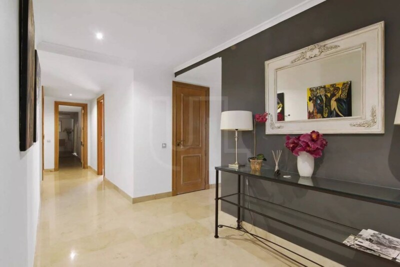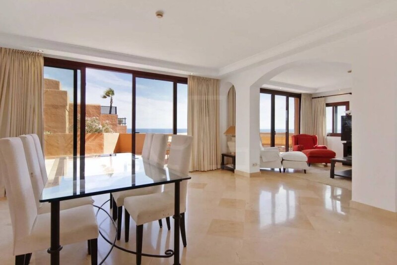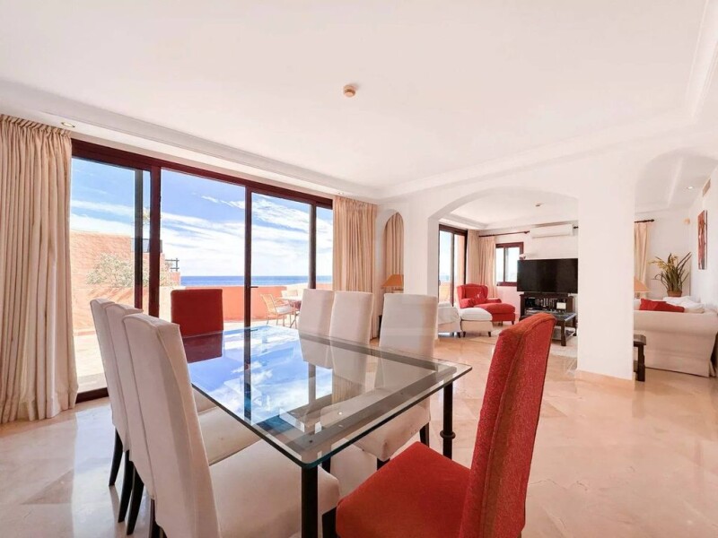 Stunning penthouse apartment located in the exclusive private wing of the Hotel Kempinski, right on the beach of the New Golden Mile in Estepona, offering spectacular front line sea views that extend to Gibraltar and northern Africa. The hotel is situated just 5 minutes from Estepona centre and 45 minutes from Malaga airport. Perched on the 9th floor, the luxury 234 sq.m apartment boasts large sunlit rooms and an expansive open terrace with outdoor dining table, chill out area and a private jacuzzi. It comprises an entrance hall, a fully fitted kitchen with beautiful mountain views, a spacious living room with a dining area and breathtaking sea views, a master en suite bedroom featuring a walk-in wardrobe and direct access to the main terrace, as well as 2 guest en suite bedrooms with access to the terrace. As part of the Hotel Kempinski, owners have access to a range of world-class resort amenities including several dining options and a spectacular pool area surrounded by pristine landscaped gardens. A security gate offers direct access to the beach promenade, and 24-hour security ensures peace of mind.