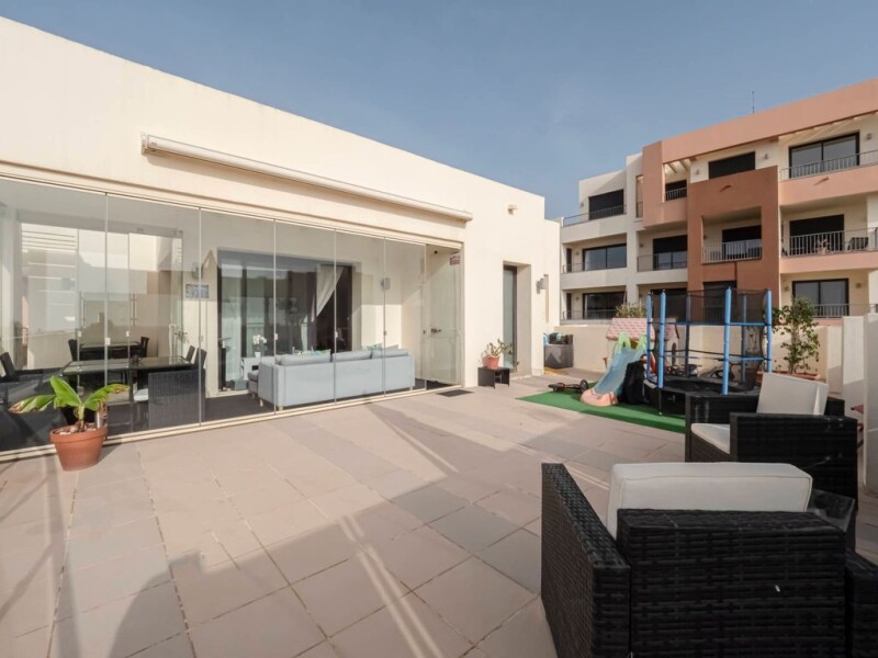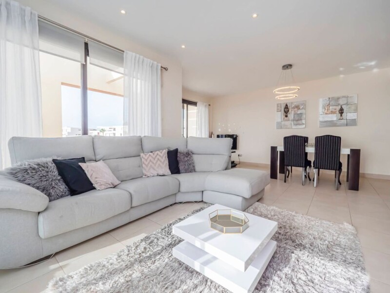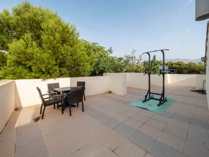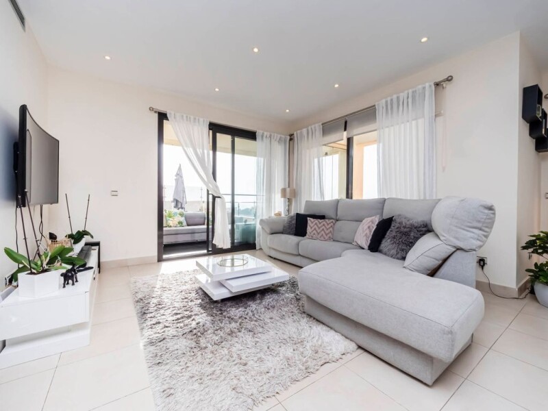 Beautiful penthouse, all on one floor south facing with panoramic views to the Coast and the Mediterranean. Living and dining area, fully fitted kitchen with Bosch appliances, laundry area, guest toilet. Master bedroom en suite and two guest bedrooms sharing a bathroom. Direct access to the spacious terraces (181m2) of which a part is enclosed with glass curtains, used as a second living area. Parking for 3 cars and a storage. Community pools, an indoor pool and a gym. Gated and 24hrs security.