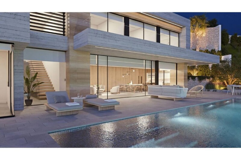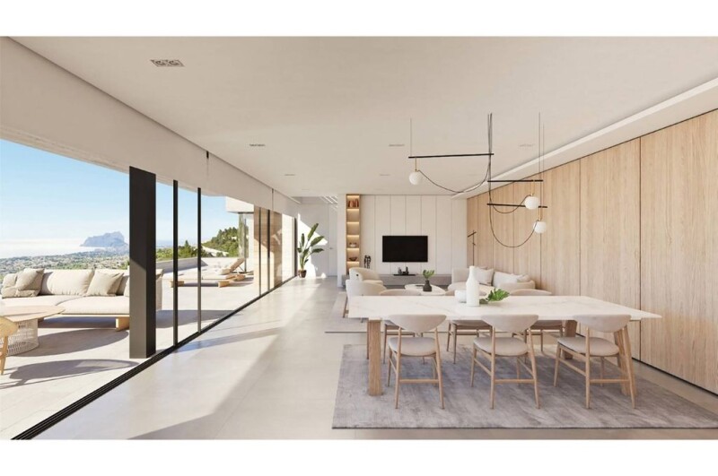 This villa offers a perfect collaboration between design, nature, views and materials used. A fusion of indoor and outdoor living, comfort, tranquillity and sea views.The villa is spread over three floors, which are connected by an elevator and stairs. On the top floor there is spacious parking and garage. By access from the elevator or stairs the next floor consists of are three spacious bedrooms; each with an en-suite bathroom and each with panoramic sea view. On this floor there is also a second lounge, of course also with sea view. One floor down there is a huge living room with a large, modern open kitchen and a beautiful master bedroom with dressing room and very luxurious bathroom, including an impressive bath with sea view. All with direct access to the large pool terrace and of course with impressive sea views. There is also a guest toilet, a laundry room and a large storage room on this floor. Below the pool terrace there are two larger multifunctional rooms, where you can create a guest house, cinema, fitness or office if desired. The pool is very spacious and has a partially glass wall. The garden around the villa is completely landscaped with beautiful Mediterranean plants and various nice places to enjoy this special part of the world. Located in Benissa, you are but a short distance to all the beautiful surrounding areas and cities this area is famous for with all its rich cultures, cuisines and spectacular sceneries, both seas and mountains. Less than an hour from Alicante airport and beautiful beaches just a short drive away. Interested? Do not hesitate and contact our office. We will be pleased to help you.