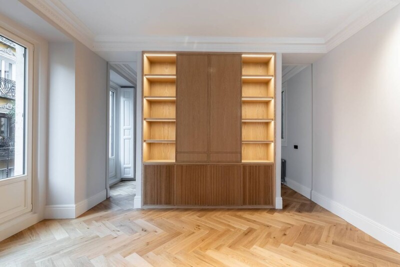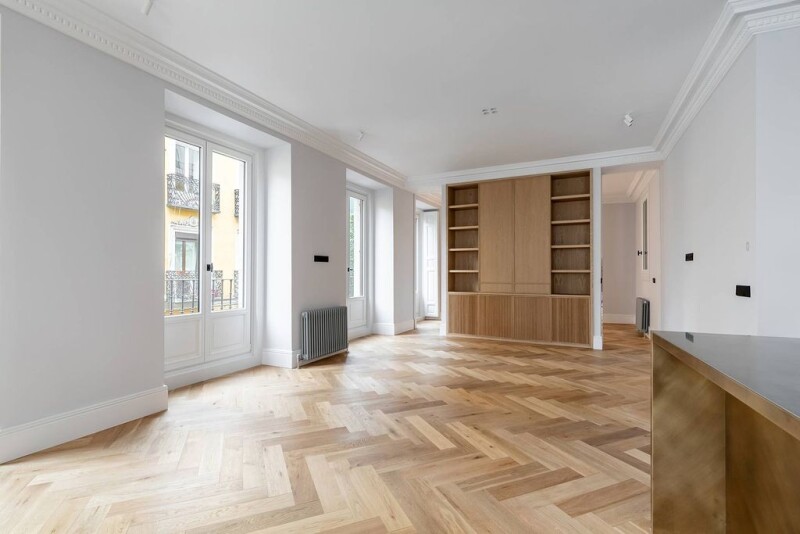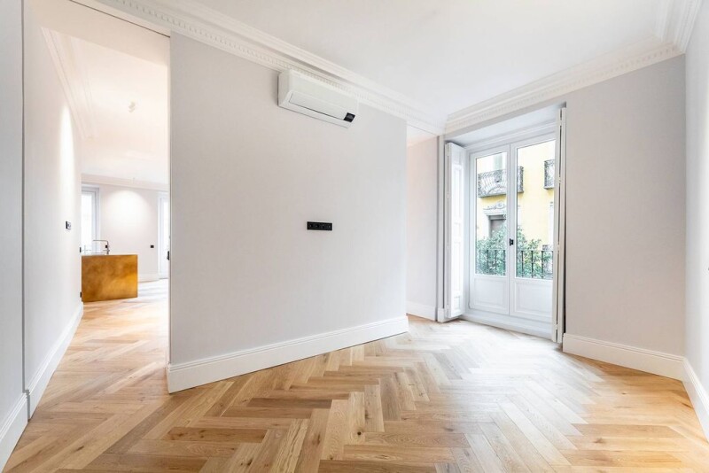 Exquisite fully renovated apartment, located in the prominent neighborhood of Justicia, on Hortaleza street. This property occupies the entire second floor and, being located on a corner, is completely exterior, allowing you to enjoy eight balconies that provide excellent brightness. The interior layout includes a spacious living-dining room, which benefits from the brightness of five balconies. The kitchen, elegant and functional, is equipped with a central island with a brass finish, adding a touch of distinction and sophistication to the space. It is complemented by Siemens appliances and lacquered furniture in burgundy tones. In the living room, there is an impressive wooden bookcase that integrates a hidden bar cabinet. On either side of the bookcase, there are two mirrored doors that lead to an additional room with a balcony, ideal as an extra bedroom or office. The apartment offers a master bedroom en suite, all exterior with two balconies and spectacular closets, as well as another secondary bedroom en suite, oriented towards an interior patio. The spacious bathrooms stand out for their selection of tiles in select shades and oak wood furniture with an incredible design. The ceilings of the house reach a height of 3 meters, creating a sense of spaciousness and elegance. Ducted air conditioning system. Building with few neighbors. Thanks to its proximity to Fernando VI street and the main attractions of the Justicia neighborhood, this property enjoys an unbeatable location in one of the most desirable areas of the city.