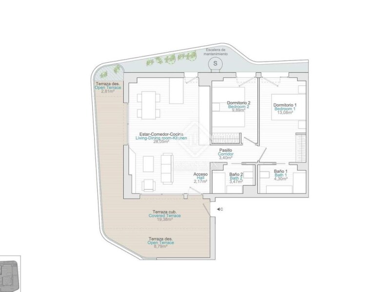 Situated on the second floor, this two-bedroom apartment boasts a spacious 31 square meter terrace. Explore the diverse options available in this residential complex - contact us today to discover the one that suits your preferences best!.