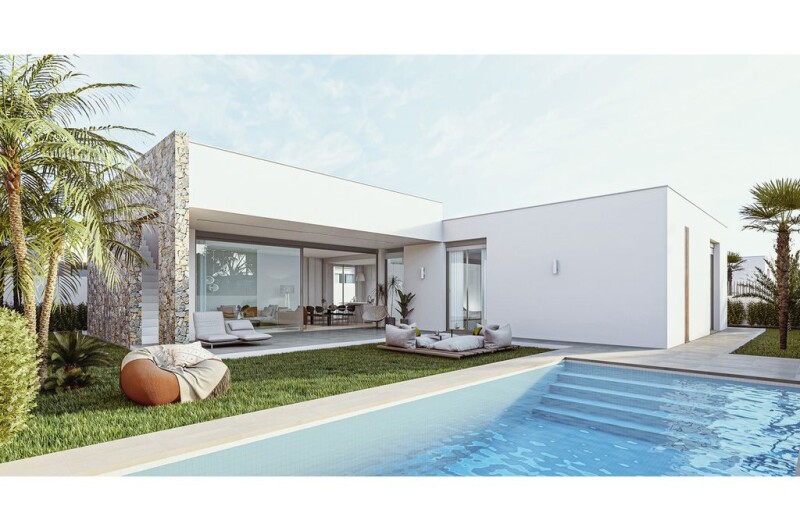 New villa project, 500m from the beach in the coastal town of Mar de Cristal, on the Costa Cálida. The town offers a wide variety of daily necessities and restaurants all year ‘round. Modern, single storey villas plus solarium, with 3 bedrooms and 2 bathrooms, built on plots of 413m2. The open-plan living area includes the dining area, kitchen and lounge, which opens onto two separate terraces. The master bedroom has a private bathroom and walk-in closet. The main terrace is partially covered, offering the ideal space to enjoy the Spanish outdoor lifestyle by the pool. The solarium offers panoramic views of the area, and can be accessed by an external staircase from the Mediterranean style garden. The villas include pre-installed ducted A/C, fitted wardrobes, laundry room, landscaped garden, private pool, and parking on the premises for up to two cars. Mar de Cristal has beautiful sandy beaches, a tennis centre, marina, supermarkets, bars and restaurants. The Calblanque national park where you will find unspoilt long white sandy beaches, as well as the famous La Manga Club and the bustling town of Los Belones are all within a 5 min drive from the village. Murcia airport is 25 mins and Alicante 1 hour drive. You can also visit the historic cities of Cartagena and Murcia. Contact us today for more information!.