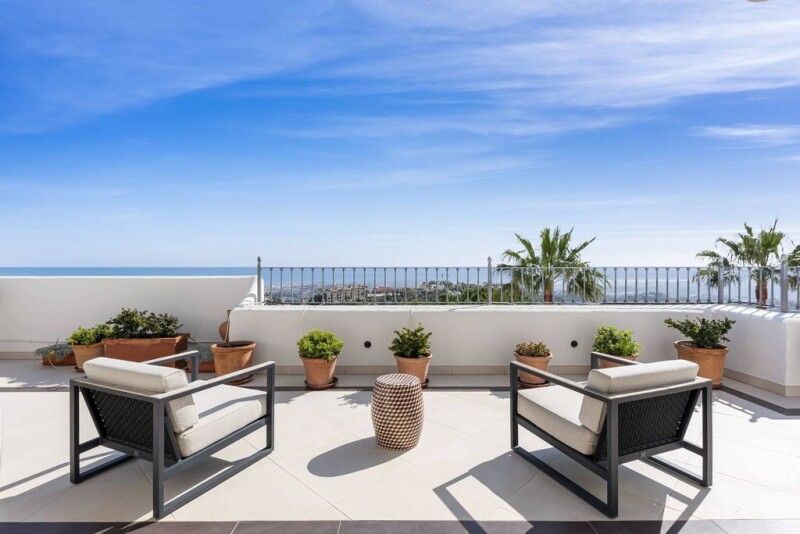 Elegant duplex penthouse with panoramic views in La Heredia, Benahavis This exquisite four-bedroom, three-bathroom duplex penthouse is located in the charming gated community of La Heredia, offering unparalleled views of the Mediterranean Sea and surrounding mountains. Combining Andalusian charm with modern comfort, this home is designed for those seeking tranquility, luxury, and breathtaking scenery in Benahavís. The main level features an open-plan living and dining area with floor-to-ceiling windows, allowing for natural light and seamless indoor-outdoor living. The fully fitted kitchen is designed for both functionality and style, offering top-of-the-line appliances. The master suite, located on the upper level, boasts a private terrace, en-suite bathroom, and stunning sea views. The additional three bedrooms provide ample space, with one featuring an en-suite bathroom and the others sharing a modern, well-appointed bathroom. The outdoor spaces elevate this penthouse’s appeal, with three spacious terraces perfect for entertaining, dining, or simply unwinding while enjoying the panoramic landscape. The community of La Heredia offers 24-hour security, cobblestone streets, vibrant plazas, and a selection of boutique shops, cafes, and restaurants, creating a unique village-style atmosphere. Located just a short drive from Puerto Banús, Marbella, and world-class golf courses, this penthouse is a rare opportunity for those seeking luxury, privacy, and breathtaking views in one of the most exclusive residential communities in Benahavís.