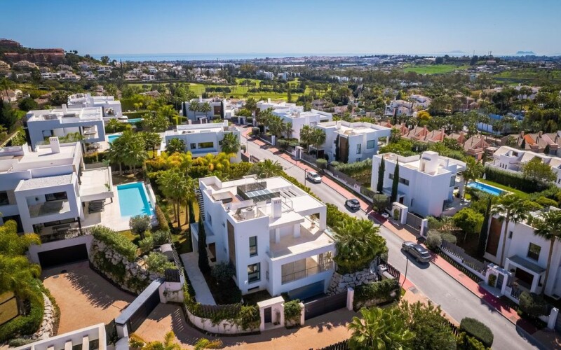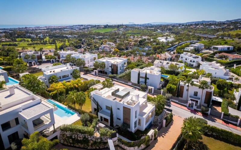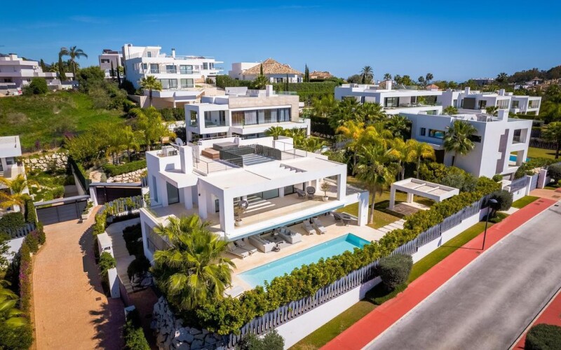 Built to top specifications and finishes, this 5-bedroom villa pays special attention to the Andalusian climate, with plenty of outside seating areas carefully shaded and perfect for relaxing.~~Distributed on three levels, it comprises, on the main floor: spacious living room with several seating areas; open-plan fully fitted kitchen/dining area equipped with top appliances and with a central island wine cooler; en-suite guest bedroom; access to the porches, terraces, heated swimming pool and the carefully landscaped garden with mature plants that surround the property create privacy from nearby homes.~~Upstairs: one guest en-suite bedrooms with fabulous views over the Golf Valley; and stunning master suite with dressing room, and a wrap-around terrace also enjoying the amazing views.~~Lower level: further 2 guest bedrooms, one of them en suite; garage for 3 cars. Possibility to add a gym or cinema on this level.~~Rooftop with panoramic and partial sea views, with chill out area and jacuzzi.~Special features include underfloor heating throughout and home automation system.~~Just minutes away from several international schools, world class golf courses, gastronomic experiences and amenities, this magnificent home is set within a quiet gated complex with 24-hour security, guaranteeing a total privacy.
