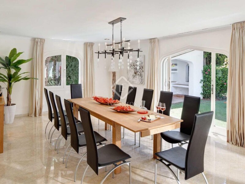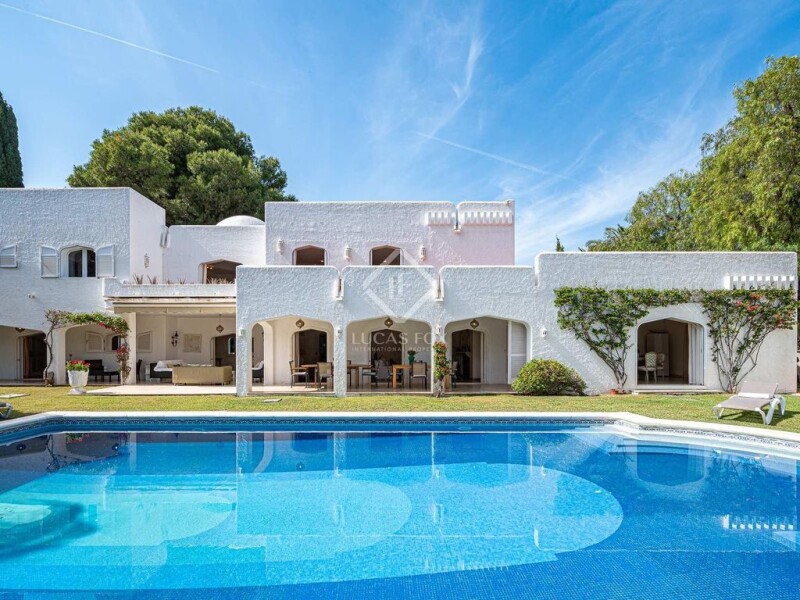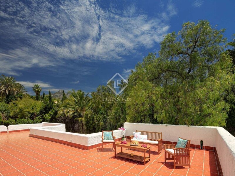 Villa La Gracia holds a much-desired location in the exclusive residential area within Nueva Andalucía, close to Puerto Banús, while Marbella is just a five-minute car journey away. The authentic and luxurious Andalusian-style villa holds a large corner plot surrounded by extensive tropical gardens giving guests a real sense of privacy and exclusivity. The main house consists of a beautiful entrance hall which leads to a spacious living room with fireplace and access to well-kept gardens, a separate dining room which connects to a fully equipped kitchen. A bedroom with own bathroom for the service is next to the kitchen as well as a laundry room and access to the garden. To the other side of the property we find an office with guest toilet and a complete bedroom with its bathroom that gives to 2 covered terraces and to the gardens. The upper floor enjoys a second living room with dome roof and access to a large sun terrace. Two guest bedrooms and a master bedroom with en-suite bathroom including a separate shower and bath. The guest house is located in front of the main house and consists of a beautiful living / dining room with modern kitchen and 3 bedrooms with 2 bathrooms and a large central hall with high ceilings with natural light. The tropical gardens are very well kept featuring a custom built barbecue near a large family pool. The property has a central fountain at the entrance and a garage for several vehicles plus an additional parking.