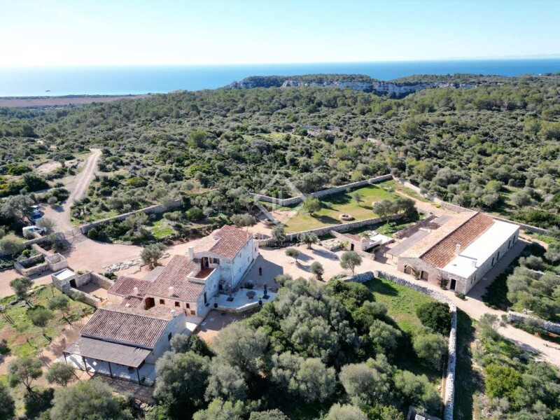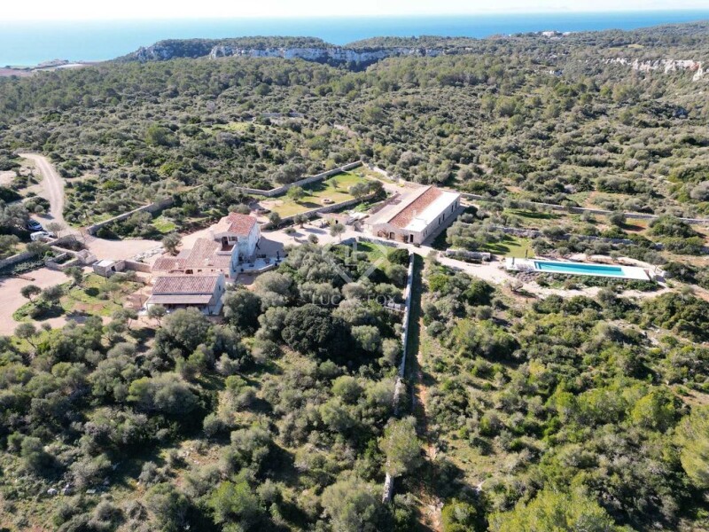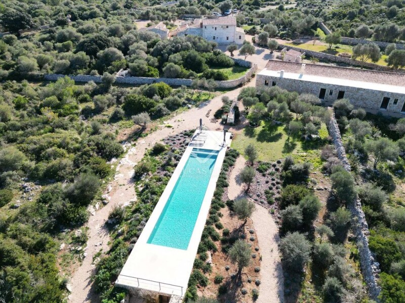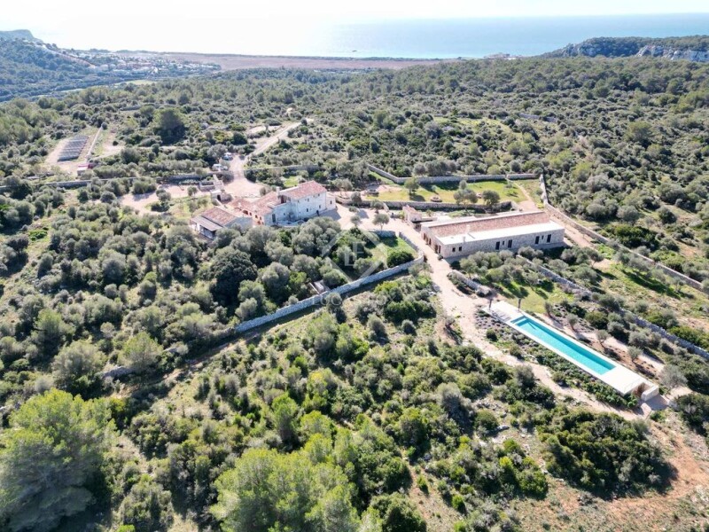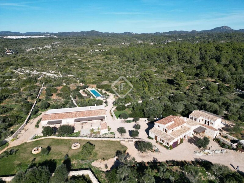 Lucas Fox presents this idyllic rustic building in the middle of nature adjacent to the famous Son Bou nature reserve, Alaior. La Finca is surrounded by 80 hectares of forest and fields and has three buildings with a total of 929 m² built; All recently renovated with exquisite taste and a mix of styles between modern, rustic and typical Menorcan architecture. The main house has a 240 m² ground floor in which we find a huge entrance hall, a living-dining room with a large fireplace built in stone, a chill-out area, a bookstore, an study that can be transformed into a bedroom, an incredible and huge fully equipped kitchen, a full bathroom and a utility room with an old wood oven. The main rooms have high ceilings with groined vaults and walls of Menorcan and marés stone. The house maintains original parts from the 1896 construction, but most of it has been lovingly rebuilt, maintaining the essence and history of the place. This entire floor has travertine marble floors with underfloor heating. Through a beautiful wooden staircase, we can access the first floor of 82 m² where we find two double bedrooms with private bathrooms. Finally, the main bedroom, in addition to a private bathroom, has access to a private terrace with incredible views of the surrounding countryside . At the back of the main house we find a newly built annex of 73 m² on one floor, which houses two bedrooms with private bathroom and an independent apartment with kitchen and private bathroom. These three rooms are accessed through a private porch with views of the countryside. The third building is an old cowshed that has also been expanded and renovated with incredible attention to the style and essence of Menorcan architecture. Here we find two huge living areas with sofas and exhibition and work tables for artistic workshops, a large dining room and a huge fully equipped closed kitchen with storage. From the living room, you can access the bedrooms, a total of four, with two complete bathrooms to share between the four of them. All bedrooms have access to the exterior and the pool. All rooms have hot/cold air conditioning system with home automation control. Additionally, the home automation system throughout the house includes cameras and alarm that can be controlled from an app. La Finca has a drinking water well and solar panels. The exterior is surrounded by lush vegetation, garden areas , an vegetable garden with fruit trees and fields of flowers and olive trees. The 72 m² pool is access and is in a secluded area quite high on La Finca, for greater privacy in the middle of nature. The surrounding land is mostly wild, it even has a family of wild goats that live around La Finca and animals of a protected species. This is without a doubt one of the most exclusive and charming properties on the entire island to spend time with family and/or friends in the middle of nature. Contact us for more information or to arrange a visit.