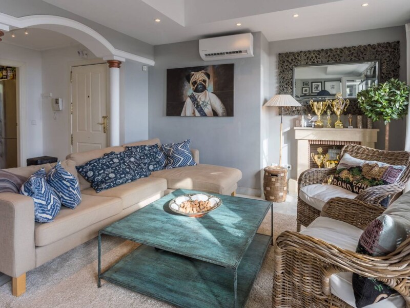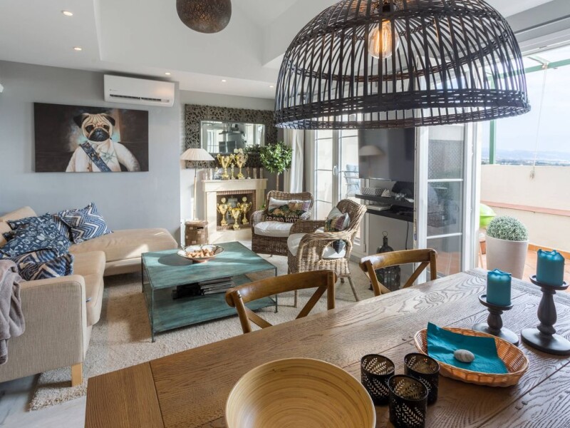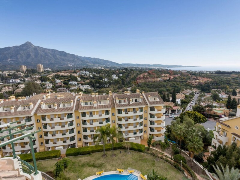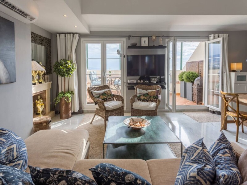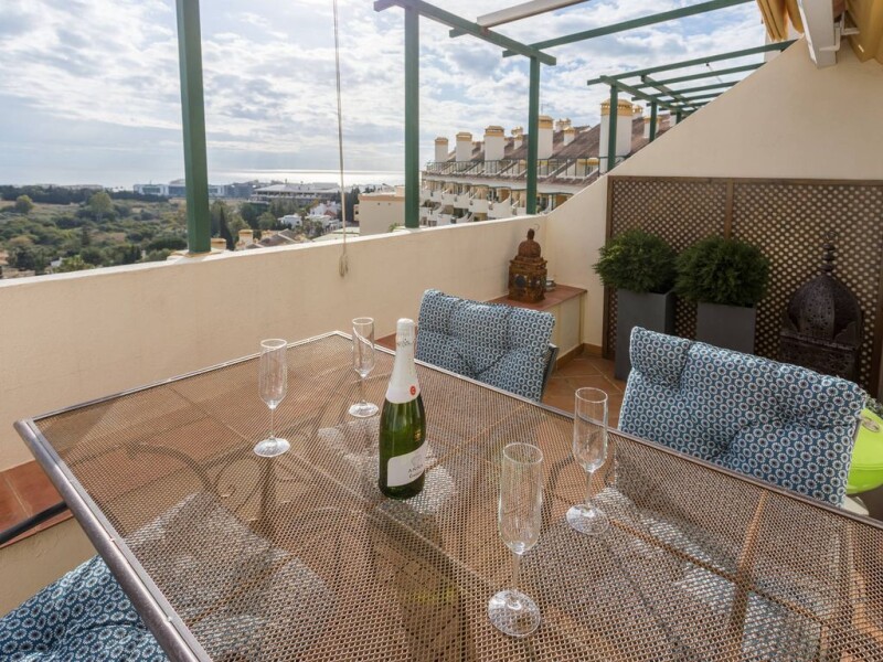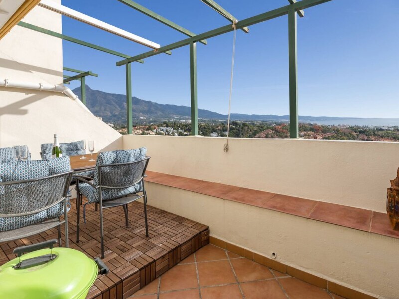 Duplex penthouse on the 5th floor in a top location in Nueva Andalucia, walking distance to Centro Plaza and Puerto Banus. East to South facing terraces with fantastic panoramic sea and coastal views. Main floor: Living and dining area, fully fitted kitchen with laundry area, one guest bedroom and bathroom. Direct access to a nice big terrace. Upper floor: Master bedroom en suite and terrace facing south (evening sun). Garage space and storage included. Furniture negotiable. Great rental income, very interesting investment!.