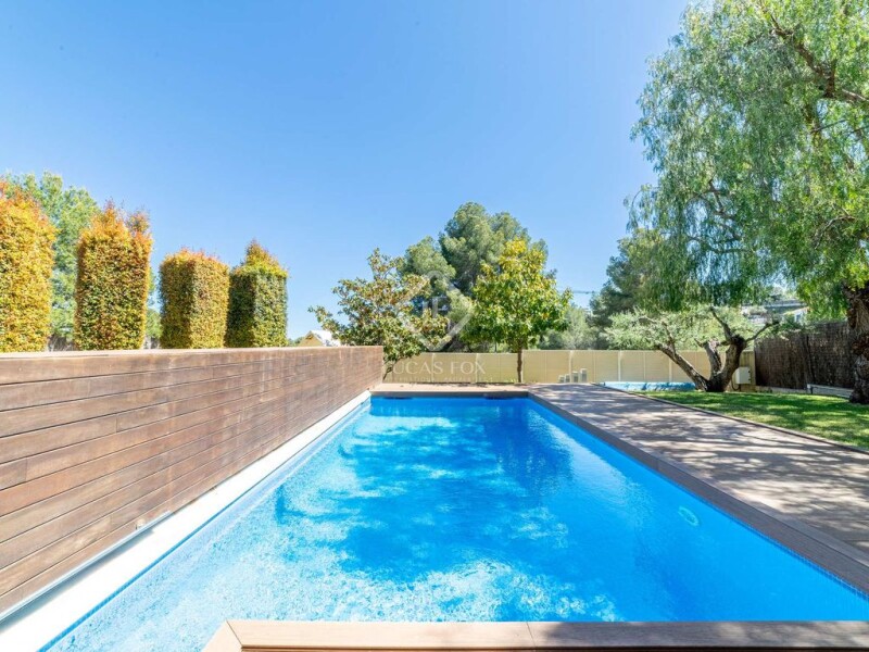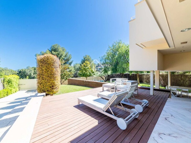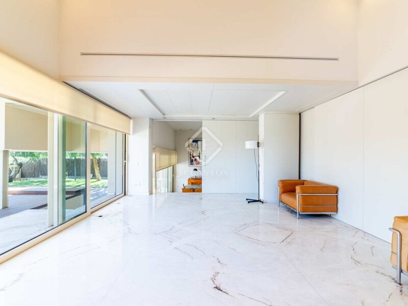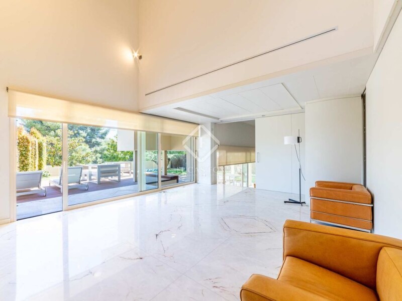 This stunning villa, designed by the renowned architect José Antonio Corrales, sits in the privileged neighbourhood of Can Girona, Sitges, overlooking the natural surroundings and the sea. We enter the property through the garden, which takes us to the main door at the back of the house. The hallway, with a guest toilet to the right, leads us into the large living room with impressive double height ceilings. A wall of glass windows opens onto the terrace. Back in the hallway, descending to the lower level, we find the dining room to the left which opens up directly to a porch area and the pool and garden. This room is also connected to the living room above by a sliding wall, providing versatility. The fully equipped industrial style kitchen with island, stainless steel finishes and Miele appliances is found at the end of the corridor and has access to the outdoors. It could be very easily opened up to the dining room as there are no load bearing walls. The 2-car garage is also accessed on this floor. The wooden staircase with stainless steel bannister or the hydraulic lift takes us up to the first floor along a hallway mezzanine overlooking the living room below. At the end, we find 2 large double bedrooms, both with en-suite bathrooms and direct access to an ample sized terrace. Lastly, the second floor boasts a large main suite with its own private, immense terrace from which to enjoy the stunning views. In addition, a spiral staircase takes us up to a further roof terrace. The lower floors of the villa house the service areas, store rooms and a further 2 double bedrooms and bathrooms. The pretty exterior at the front of the house consists of a pool surrounded by wooden decking on 2 levels, covered porches, a lawn with a variety of mature trees, offering privacy from the neighbours as well as much-needed shade in the hotter months. The garage is reached at the back of the house, also with plenty of shady areas and attractive planting. There is a practical roundabout for easy manoeuvring and a covered area for additional cars. The finishes include stunning marble flooring on the ground floors and bathrooms and natural cherrywood floors in the bedrooms. This fantastic opportunity, offered at an unbeatable price for this neighbourhood, allows the new owners the possibility of adapting the space to suit their lifestyle. Please contact us for further information.