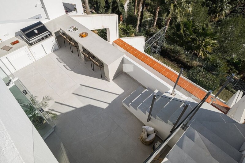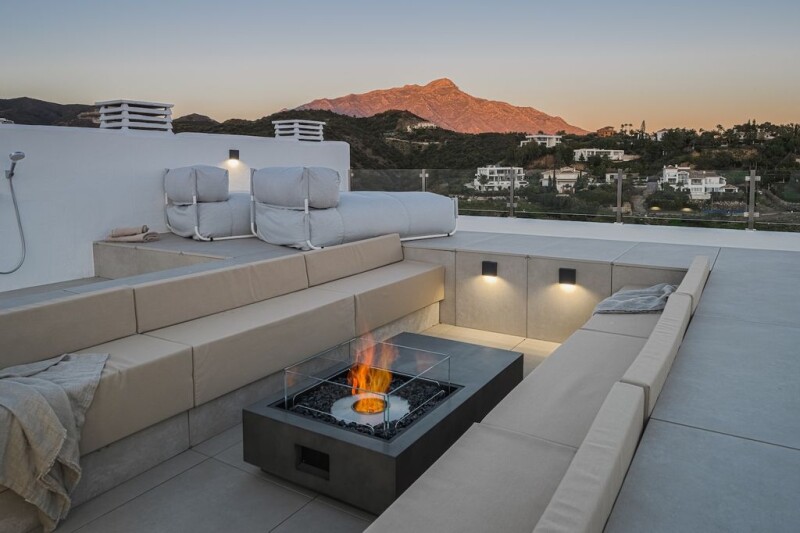 Refurbished penthouse located in a very quiet and well kept community in La Quinta offering panoramic view over the mountains as well as spectacular golf and sea views. This penthouse offers 2 bedrooms, 2 bathrooms and a unique outdoor area that can’t get any better. Large glass doors open up from the living room and kitchen area to the first terrace where you can enjoy the views from the dining bar. The stairs lead you up to a huge roof top terrace with a cozy custom built lounge with a fireplace, sun beds and a second lounge area, all with stunning views and tranquillity. The mix of carefully chosen materials of wood, micro- cement and tiles gives the property a warm modern boho feeling throughout. With only a 10 minute drive to the nearest beach and 2 minutes walk to the famous Westin Hotel, you are close to all amenities.
