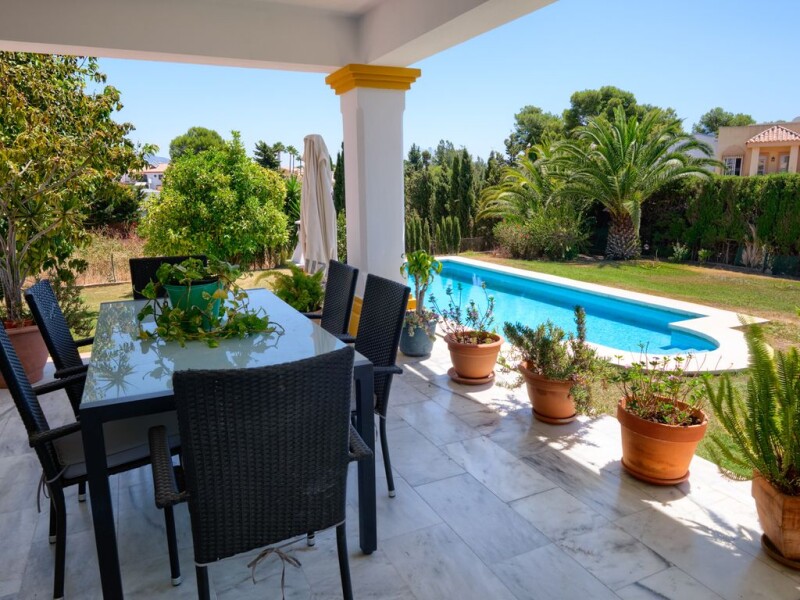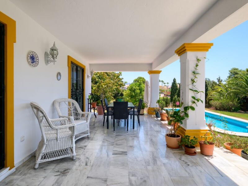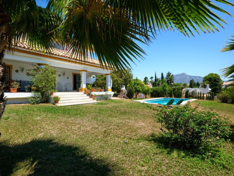 Andalucian style villa located close to Guadalmina Golf Course and the Barcelo Hotel with views to La Concha and mountains. South facing, sun all day, private. Close to all amenities. Entrance hallway, living area with fireplace, separate dining area, fully fitted kitchen with breakfast corner, pantry and laundry area. One guest bedroom and bathroom. Direct access to the covered porch, the mature garden, private pool and BBQ area. Car port. First floor. Master bedroom en suite with dressing area, two guest bedrooms sharing a bathroom, two further terraces. Big semi-basement to be done, to refurbish. A/C units in each room, solar energy for hot water.
