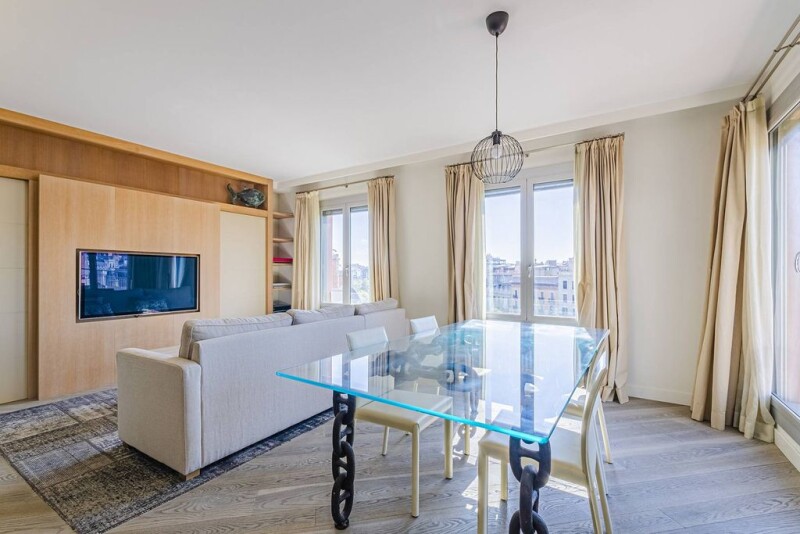 Barcelona Sotheby's International Realty is pleased to present this opportunity in Eixample Dret. It is a penthouse in the most demanded area of Barcelona, with private terrace of 18 square meters. It has two bedrooms with king size beds and one of them arranged as a suite and with direct access to the terrace. The kitchen has the particularity of being hidden under the bar, which can be slid, giving way to the rest of the kitchen. This large space is characterized by being attached to the living-dining room, which also has access to the terrace. This union of spaces makes this area extremely diaphanous and with excellent views to the avenue. A practical laundry space completes the house. The property has concierge service. Do not hesitate to contact us to visit the property and understand the splendor of this property.