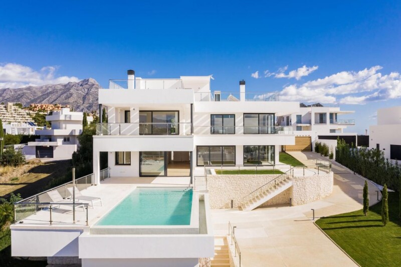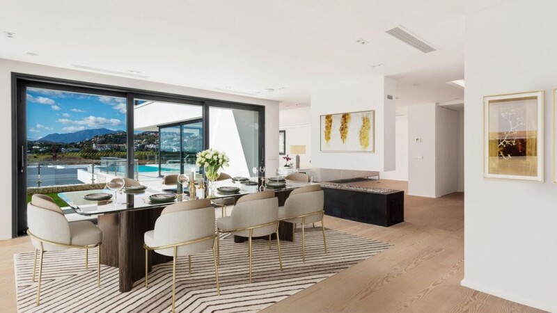 Modern new villa for sale in Nueva Andalucia, Marbella This luxurious villa is located in the prestigious area of Haza del Conde, Nueva Andalucia, Marbella, offering the perfect combination of elegance and sophistication. With a total built area of 523m² and a spacious plot of 1,200m², this property provides ample space for comfortable living and entertaining. The villa features 4 bedrooms and 4 bathrooms, providing plenty of space for family and guests. Each bedroom is beautifully appointed with fitted wardrobes and offers stunning views of the surrounding area, including the sea, mountains, and golf course. Step inside and you will be greeted by a grand entrance hall leading to a spacious living room and dining area. The fully fitted kitchen is equipped with high-end appliances and features an open plan design, perfect for those who love to cook and entertain. This property is designed with luxury and comfort in mind. It boasts a private pool, a private garden, and a private garage, providing a serene and tranquil outdoor space. The pool can be heated, allowing for year-round enjoyment, and there is a covered terrace and a barbeque area for outdoor dining and entertaining. Additional features of this villa include air conditioning throughout, a basement, a storage room, a gym, an alarm system, and a laundry room. The property is in excellent condition and offers panoramic views of the surrounding area. Located close to golf courses, amenities, and with easy access to the beach, this villa is the perfect choice for those seeking a luxurious and exclusive lifestyle in Marbella. Don't miss the opportunity to own this stunning property - contact us today for more information and to arrange a viewing.