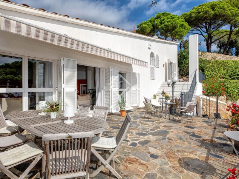 Lucas Fox presents this impressive, uniquely designed house with beautiful sea views, in the quiet Puig Romaní development , in Platja d'Aro, just 2 kilometres from the famous centre of this town and its beautiful beaches and coves. This high-end villa is spread over two floors and has a surface area of 421 m², plus a plot of 1,409 m². It has a total of six bedrooms, three bathrooms and a guest toilet . It benefits from an open areas layout , which maximises comfort for the whole family and friends. On the main floor , a spacious and unique living-dining room gives access to a large terrace with panoramic views of the sea, where the pool area with barbecue is located, perfect for relaxing and enjoying the landscape. The kitchen is independent and has an annex space as an office. On this same floor, there are four double bedrooms, including the main bedroom with a full bathroom , two complete bathrooms and a guest toilet. The ground floor has an elegant and spacious entrance hall and two large garages. It is worth noting that this villa has a separate guest area with two additional double bedrooms, a full bathroom , a spacious living-dining room and a second kitchen. The living-dining room has access to a private terrace and the pool of the main house. The house has oil heating and air conditioning. This property is energy efficient thanks to its 20 solar panels. Exterior, there are numerous outdoor areas , such as the large private pool area, chill-out areas , exterior dining room and barbecue area, all with wonderful sea views. The property, located in a quiet area surrounded by nature, offers sea views from several spaces. Please contact us for more information.