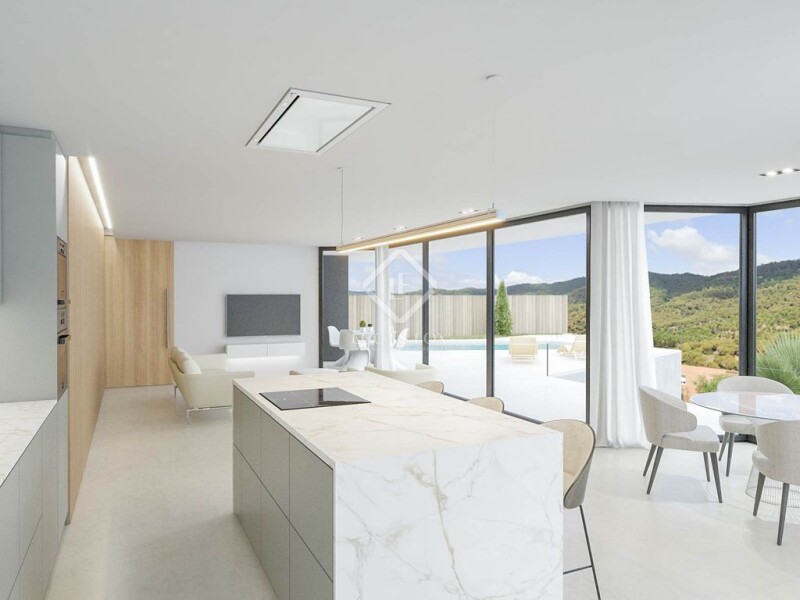Spectacular new build designer villa with a built area of 312 m2 and a plot of 567 m2, located in the La Llobera development , Cabrils. The building permit is already in place, everything is ready to begin construction, and the project can be completed in approximately 12 months once work begins. The house's design is characterized by its elegant and modern architecture, striking luminosity, minimalist decor, high-end materials, and LED lighting throughout. The maximum amount of glazing possible was used to maximize light and efficiently connect the interior with the exterior , always striving for maximum energy efficiency. In the floor we find the garage with capacity for 2 cars, a machine room, and a large open-plan room of 28 m2 as a multipurpose room. The ground floor, with all its spaces visually connected, includes an entrance hall , a large dining room living room , a large open-plan, fully-equipped kitchen, a hall, a guest toilet , and a utility room . The living dining room living room and kitchen, with sliding windows, have direct access to the garden and pool with panoramic mountain views. Privacy also finds its place on the first floor, where the night area is located. On this floor, we have a beautiful hall and 4 spacious bedrooms; the 25 m2 master suite stands out with views of the beautiful garden, sky, and mountains, giving a feeling of spaciousness, peace, and well-being with sliding French doors. This bedroom has its own bathroom and a beautiful built-in dressing room. Three bedrooms share a bathroom. All floors are connected by a designer staircase. The house features ducted air conditioning (hot/cold), a swimming pool, a fully equipped kitchen with top-of-the-line appliances , thermally broken exterior carpentry, and low-emission glass. It also features a heat recovery system, a ventilation system that serves a triple function: it renews the interior air throughout the property, heats it, and saves energy in the process. This allows for the recovery of a significant percentage of the energy used for air conditioning, which would otherwise be wasted. Don't hesitate to ask us for more information and visit the site on-site. We also offer the possibility of visiting a completed project with similar characteristics.