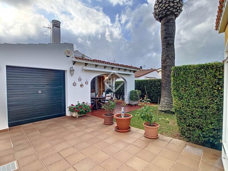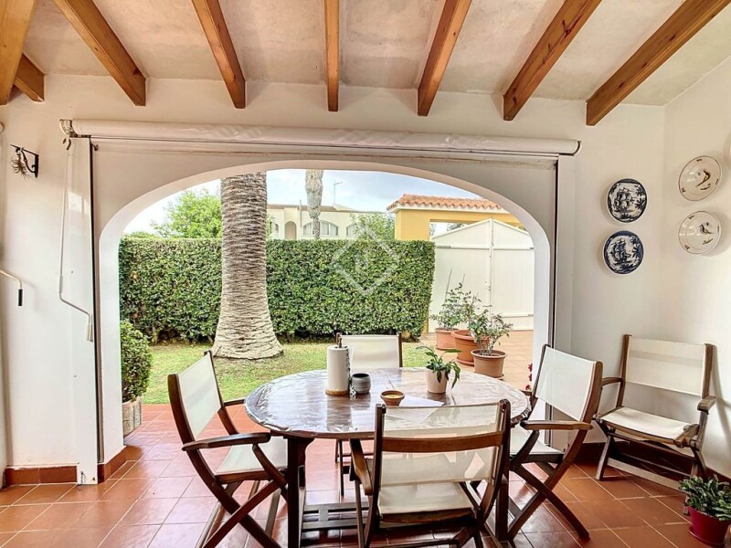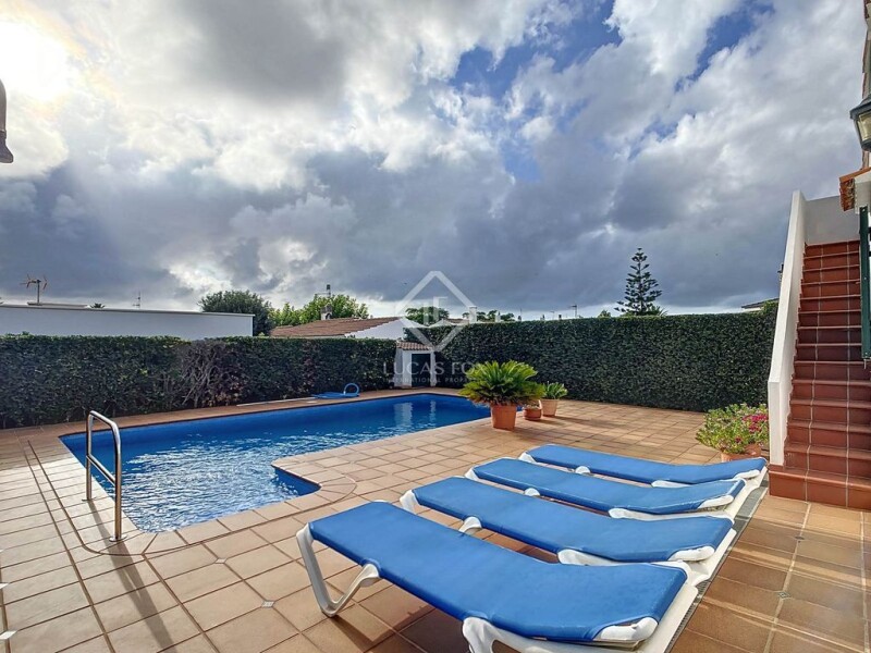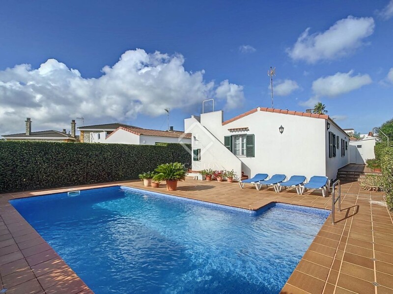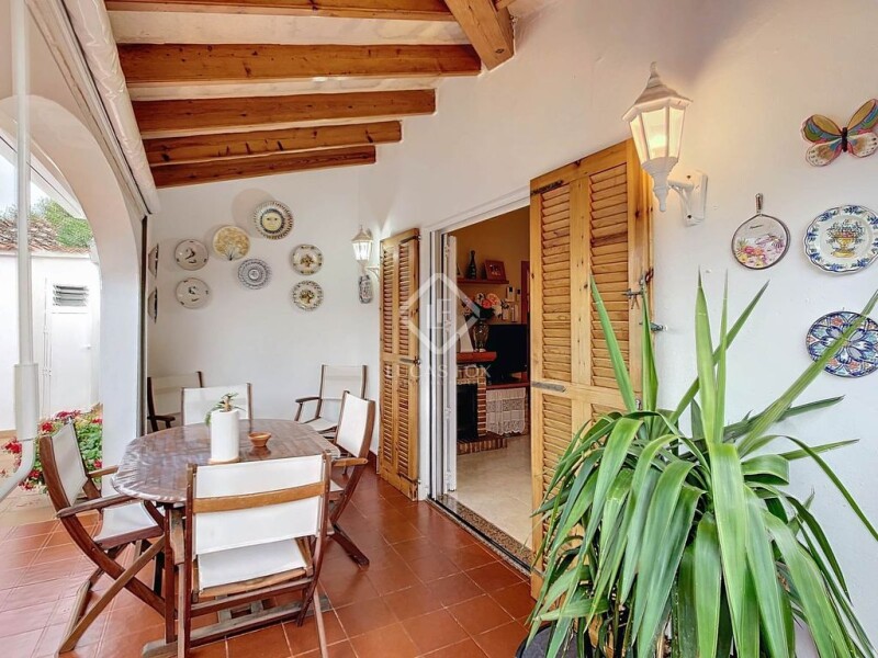 Lucas Fox presents this wonderful 160 m² villa on a 400 m² plot in the Cala'n Blanes development , in the municipality of Ciutadella de Menorca. The property is distributed on the ground floor. At the entrance, we are greeted by a charming covered porch with exposed wooden beams, an awning and transparent plastic tarps to close it in the winter seasons. Once inside, we access the living-dining room with a wood-burning fireplace. Folding doors lead us to the kitchen, with an open area that connects directly to the dining room. From this room we enter the garage/ utility room and a single bedroom . Through a hall corridor we find a bathroom, the main bedroom, another single bedroom and a living room that connects to the kitchen. Finally, there is a flight of stairs that takes us to the 35 m² basement used as a storage room. From the living room, we can access the garden and pool. The house has solar panels, hot/cold split air conditioning in the living-dining room and in the corridor , exterior aluminum enclosure with double glazing and mosquito nets on all doors and windows. Exterior, at the entrance, we find a covered barbecue and a bathroom and at the back of the house, we have a large paved solarium area that surrounds the entire 30 m² pool and a shower. Without a doubt, an ideal property to live in all year round or spend time with family and/or friends. Please contact us for more information or to arrange a visit.