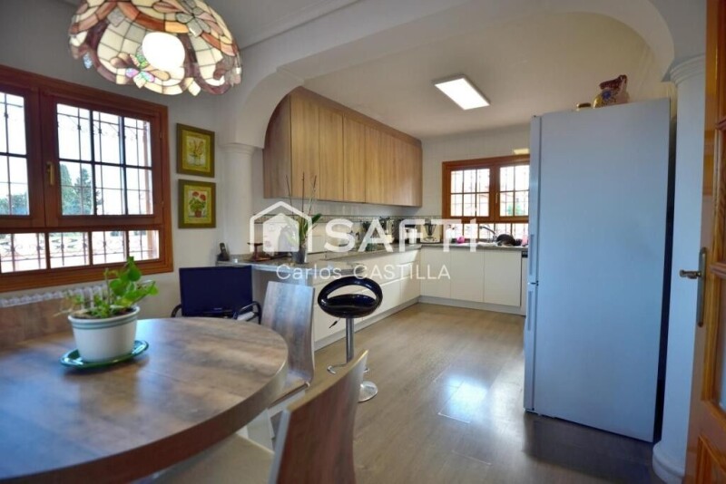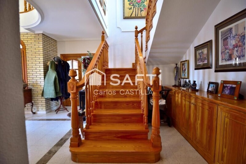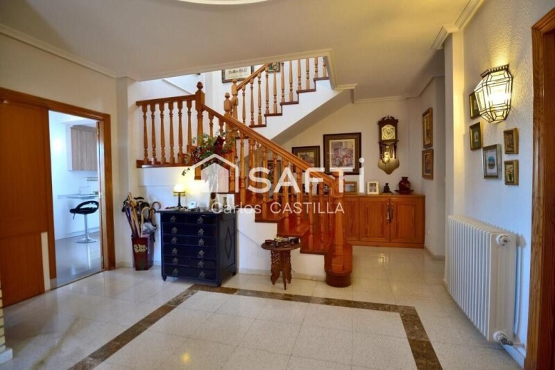 I present this villa made to whim: Nestled in an area with a lot of potential, near San Vicente del Raspeig with all services and very well connected to Alicante Capital, beaches, mountains and highways. Equipped with swimming pool, porch, garage, garden equipped with drip, heating with radiators, air conditioners, all tiled for easy maintenance avoiding gardener fees, automatic door. 12 solar panels connected to the network that supply during the day which will reduce your electricity bill. The villa consists of: On the first floor accessing a 22 m2 hall with its own personality. Living room with fireplace of 28 m2 and air conditioning. Newly renovated kitchen of 20 m2 with gallery of 5 m2, pantry of 2 m2 and cellar of 2 m2. Guest bathroom of 3.2 m2 with shower. Office of 10 m2 Bedroom of 11 m2 with built-in wardrobes. You will access the 2nd floor via a majestic staircase with a pine railing in perfect condition, which may confuse you into thinking you are in Beverly Hills. Bathroom with 6.8m2 Bedroom with 11m2 and air conditioning. Bedroom with 10m2 Master bedroom of 10m2 with air conditioning, built-in wardrobes, 5m2 en-suite bathroom, and access to a splendid 8m2 balcony with panoramic views of the Alicante mountains and the pedestrian entrance to the property. Outside there is a beautiful garden, genuine tiling with exclusive tiles for your events. A generous 20m2 garage with smoke outlets in case you want to convert it into a guest room or accommodate your favorite son-in-law. As an extra you can access all the underground facilities of the property. Visit this great property and compare this information with your trusted advisor, we have the best financial services and trusted tax advisors.
